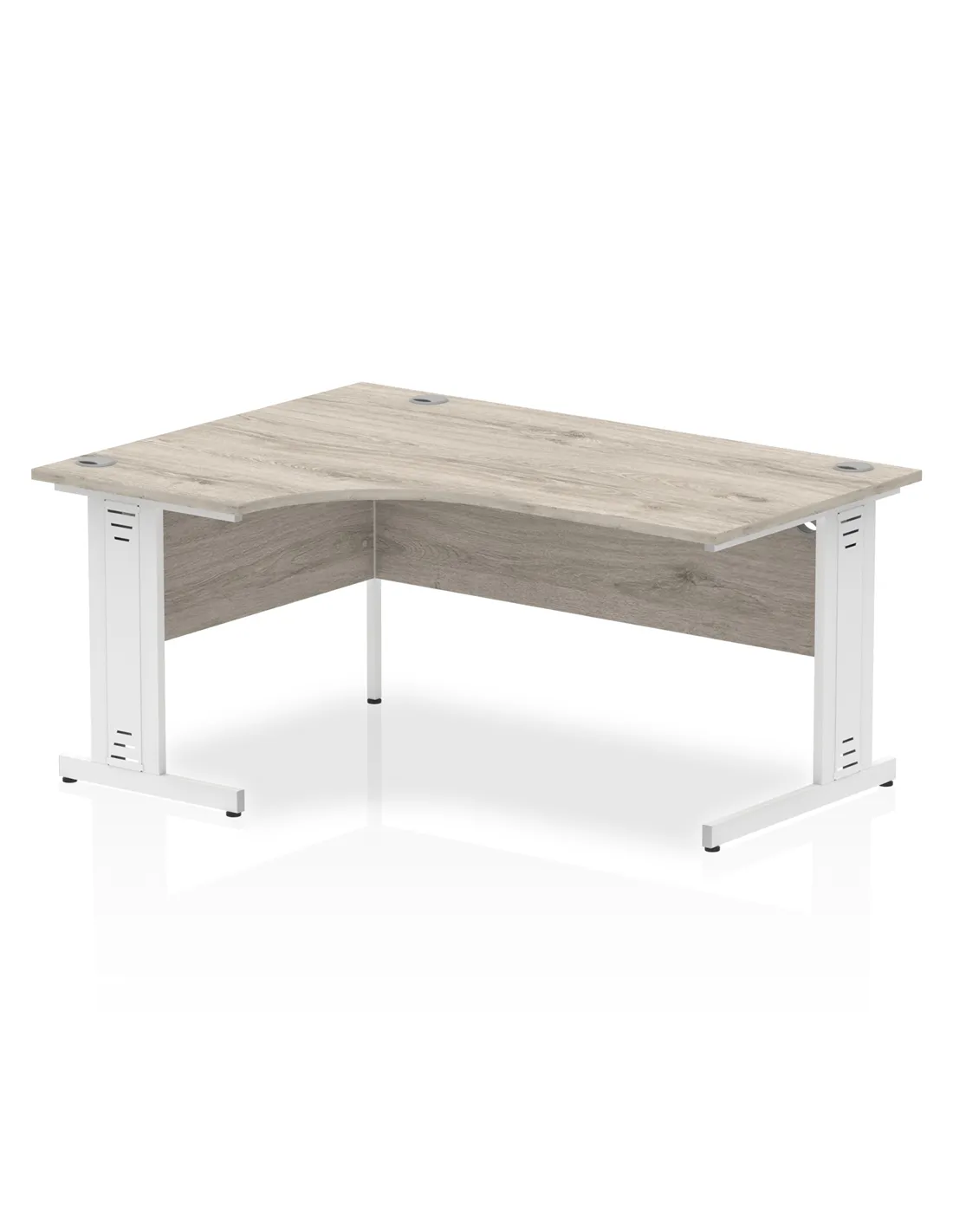 - The desk features a durable 25mm thick Grey Oak melamine top with a heat-resistant beech finish, complemented by white-coated double strut legs. The 18mm modesty panel and 2mm protective ABS edging enhance both aesthetics and durability, ensuring long-lasting performance.