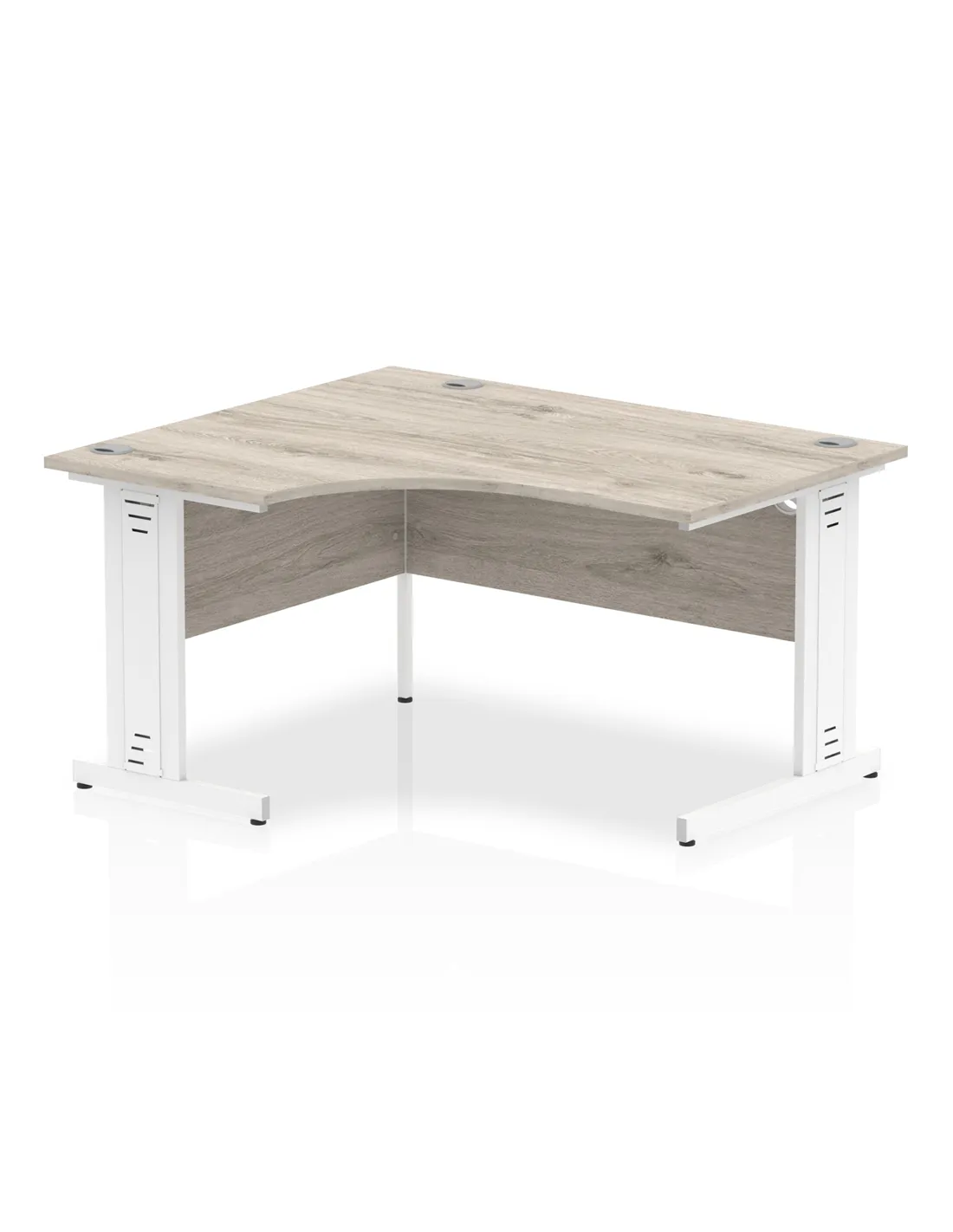 - This versatile crescent-shaped desk is perfect for home offices, corporate workspaces, and creative studios. Its spacious 1400mm width and 1200mm depth provide ample room for computers, paperwork, and accessories, while the cable-managed white legs keep your workspace tidy. The heat-resistant grey oak finish adds a modern touch that complements various interior styles.