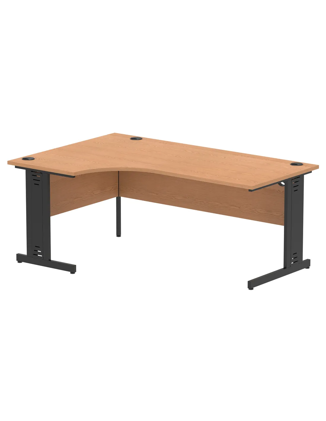Featuring a spacious 1800mm wide left crescent oak-effect top, this desk offers ample room for work essentials while maintaining an elegant profile. The heat-resistant melamine finish ensures longevity and easy maintenance, ideal for busy environments. Its black cable-managed legs keep wires organised and out of sight, promoting a tidy and efficient workspace.