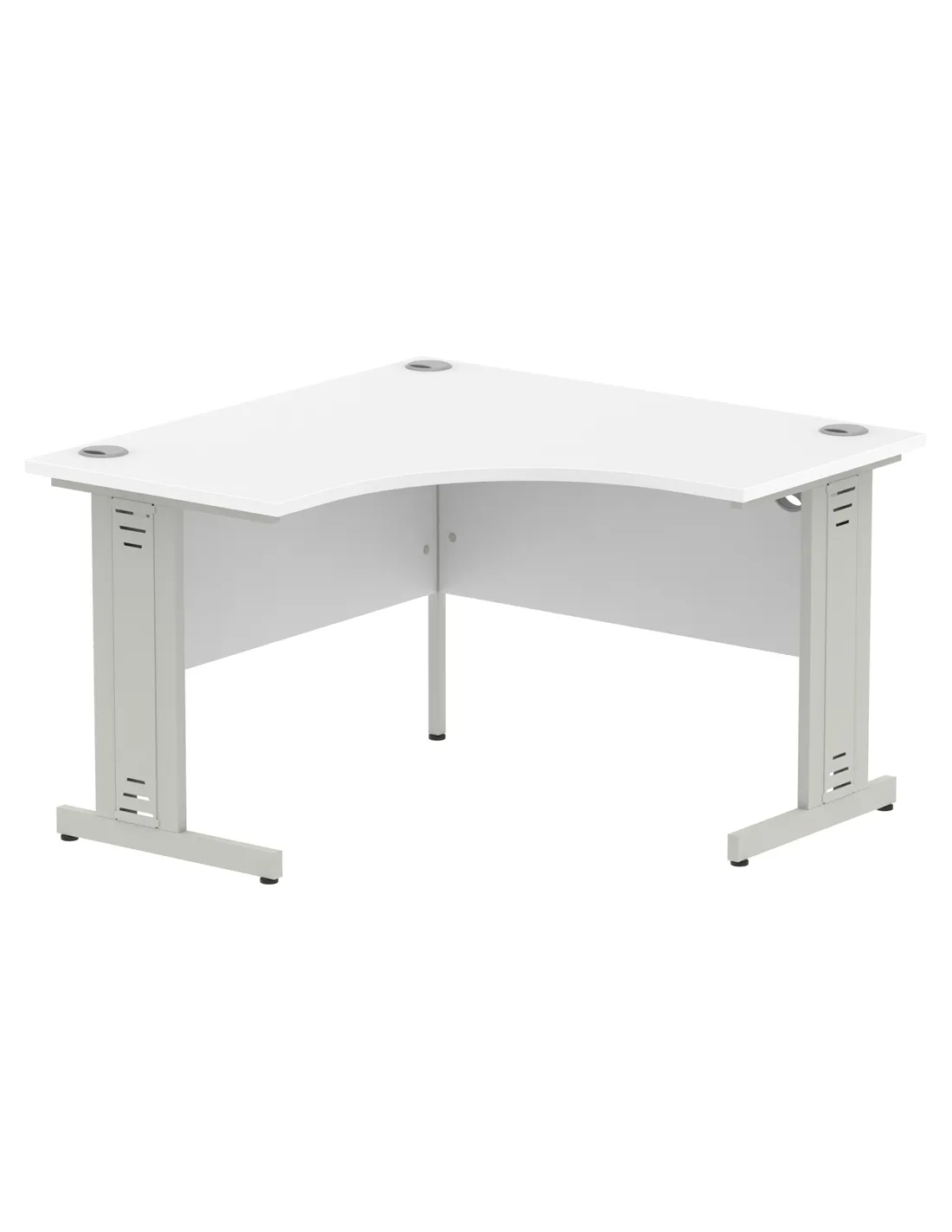 Constructed from durable MFC with a 25mm white melamine top, the desk offers a heat-resistant surface combined with silver-coated double strut legs for stability. The 18mm modesty panels and 2mm protective edging ensure both durability and a polished appearance.