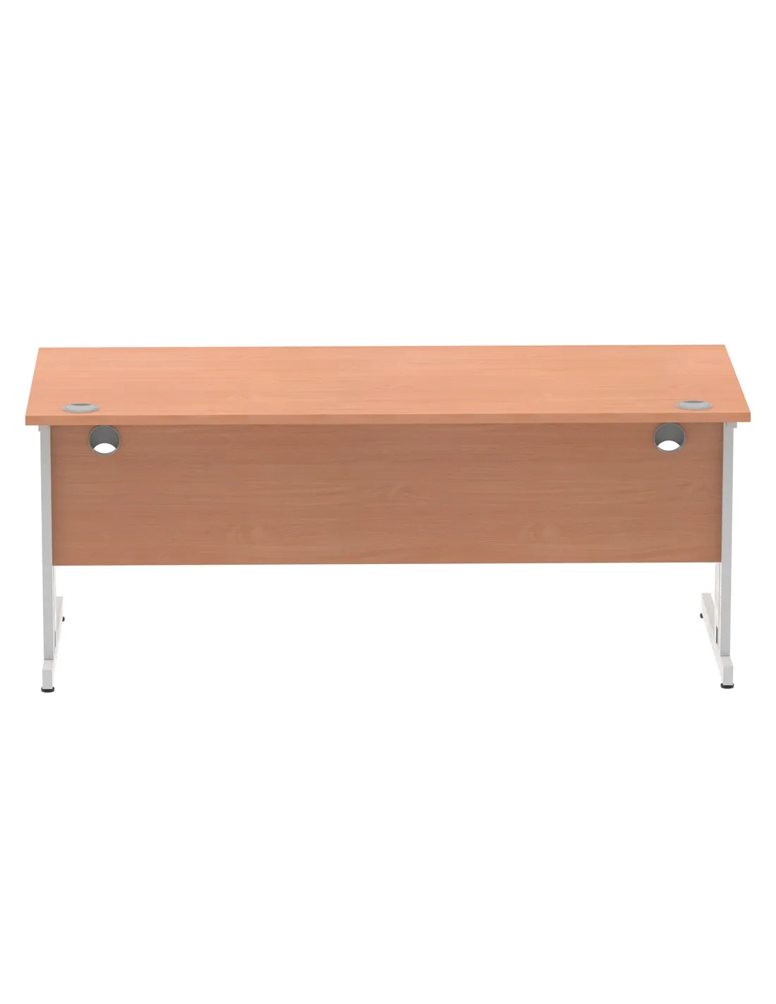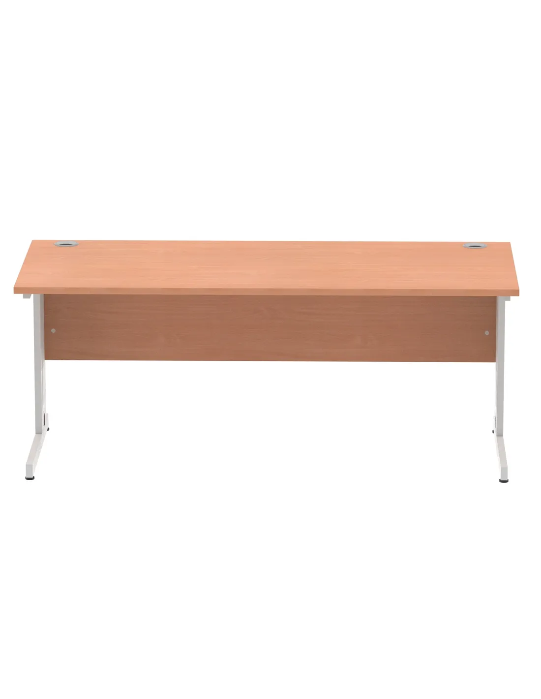 - The desk features a durable 25mm thick beech melamine top with heat-resistant properties, complemented by silver-coated double strut legs. The 18mm modesty panel and 2mm protective ABS edging add to its robustness and refined appearance.
