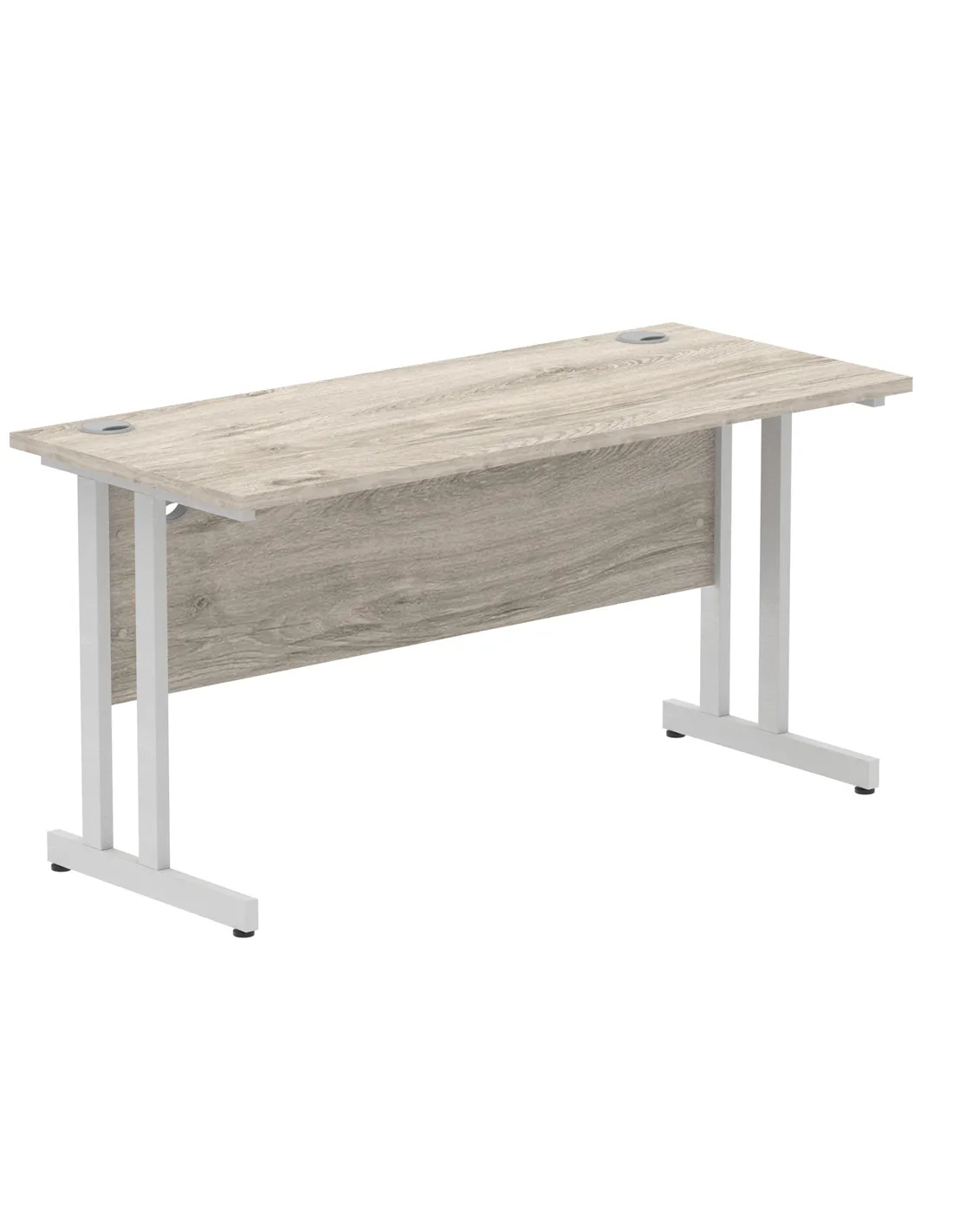 - This versatile desk is ideal for home offices, corporate workspaces, and study areas. Its compact size and durable Grey Oak melamine surface make it perfect for daily tasks, computer work, and meetings. The silver cantilever legs add a modern touch, blending seamlessly with various interior styles.