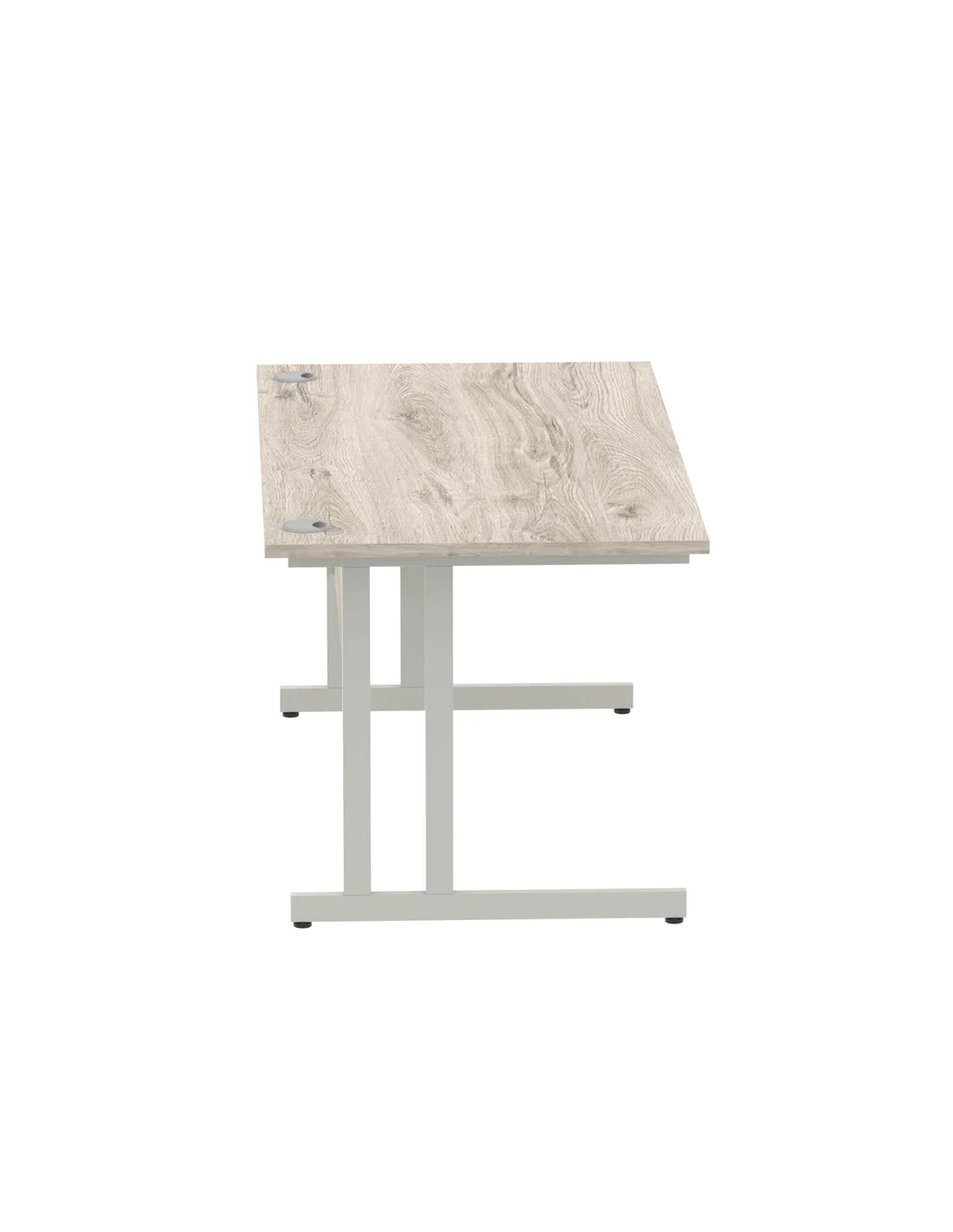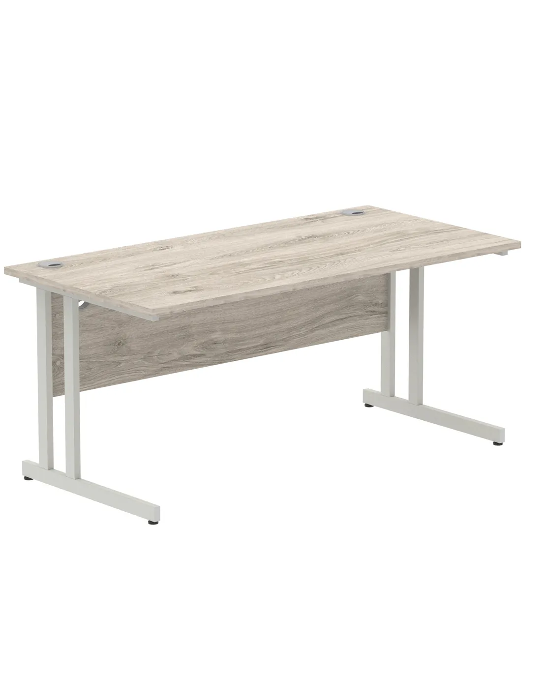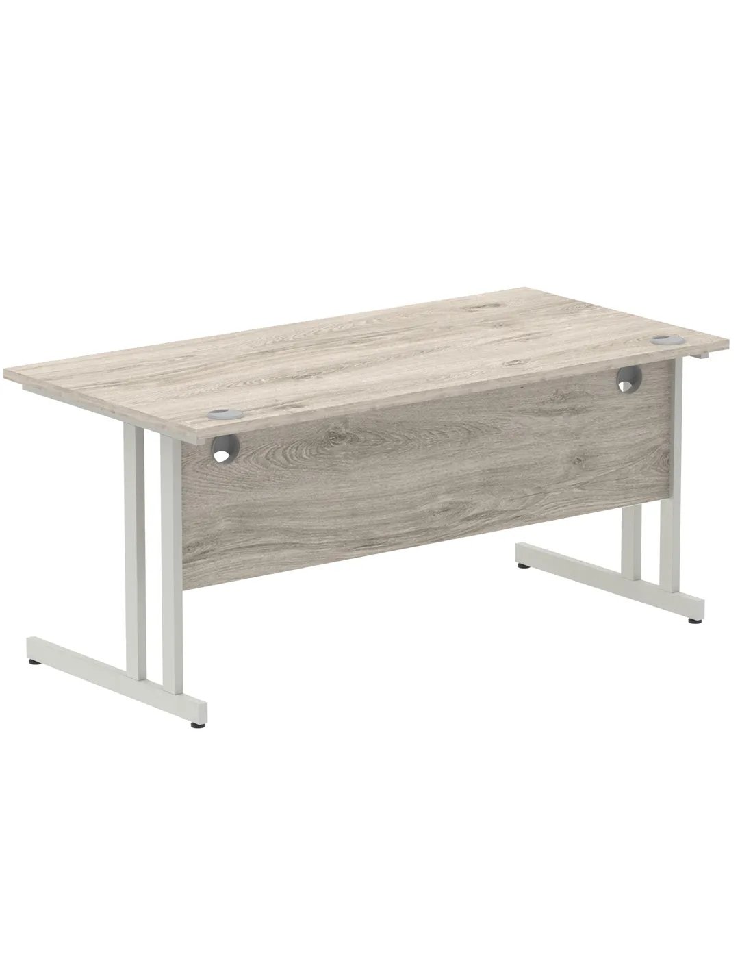 - This versatile desk is perfect for home offices, corporate workspaces, and study areas. Its spacious 1600mm width and durable Grey Oak melamine surface provide ample room for computers, paperwork, and office accessories. The silver cantilever legs add a modern touch, making it suitable for both professional and contemporary interiors.
