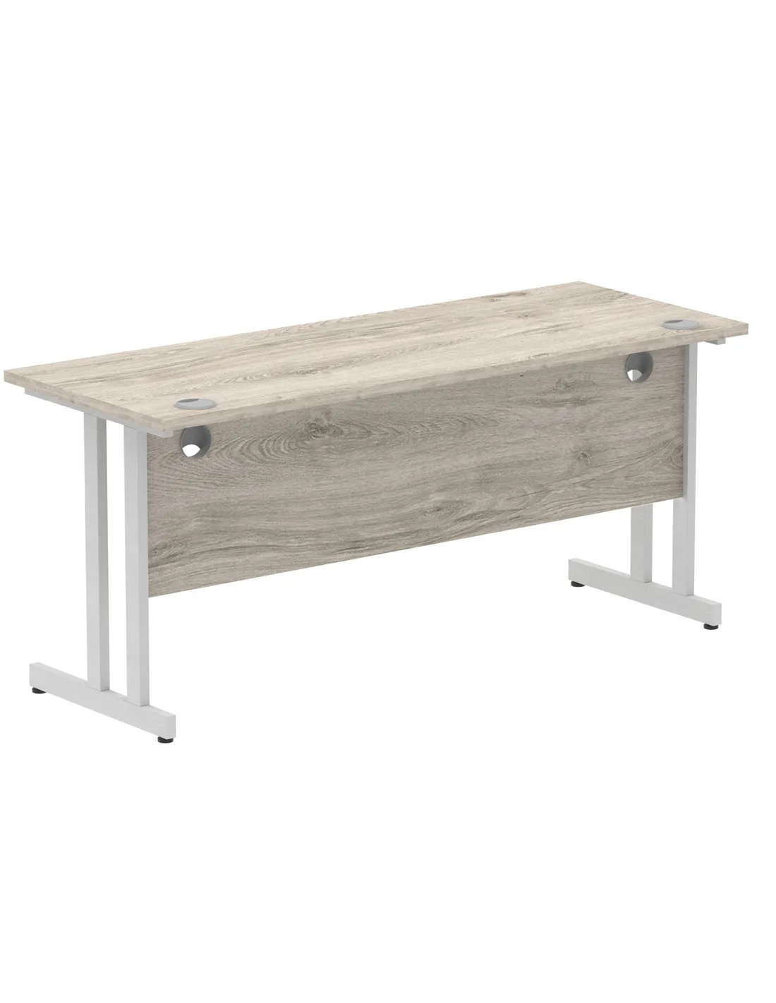 - This versatile desk is ideal for home offices, corporate workspaces, and study areas. Its straight design with a heat-resistant Grey Oak melamine surface and silver cantilever legs offers a modern, professional look that fits seamlessly into various interior styles. Whether for computer work, paperwork, or meetings, it provides a sturdy and spacious surface to enhance productivity.