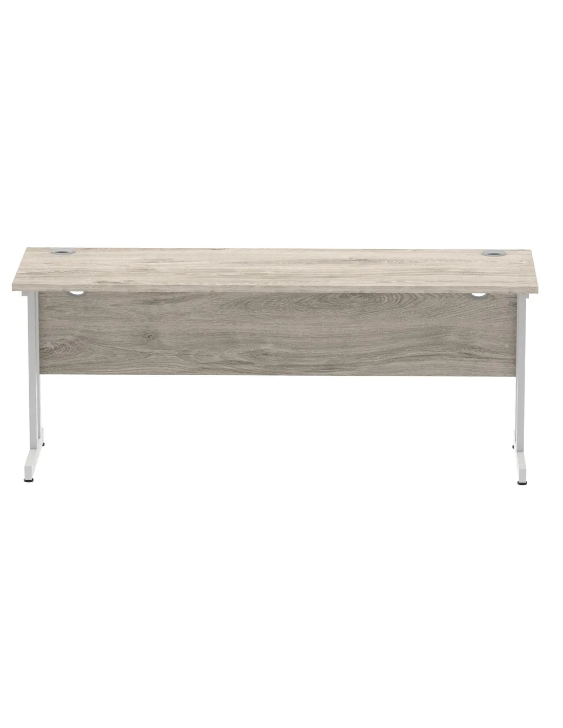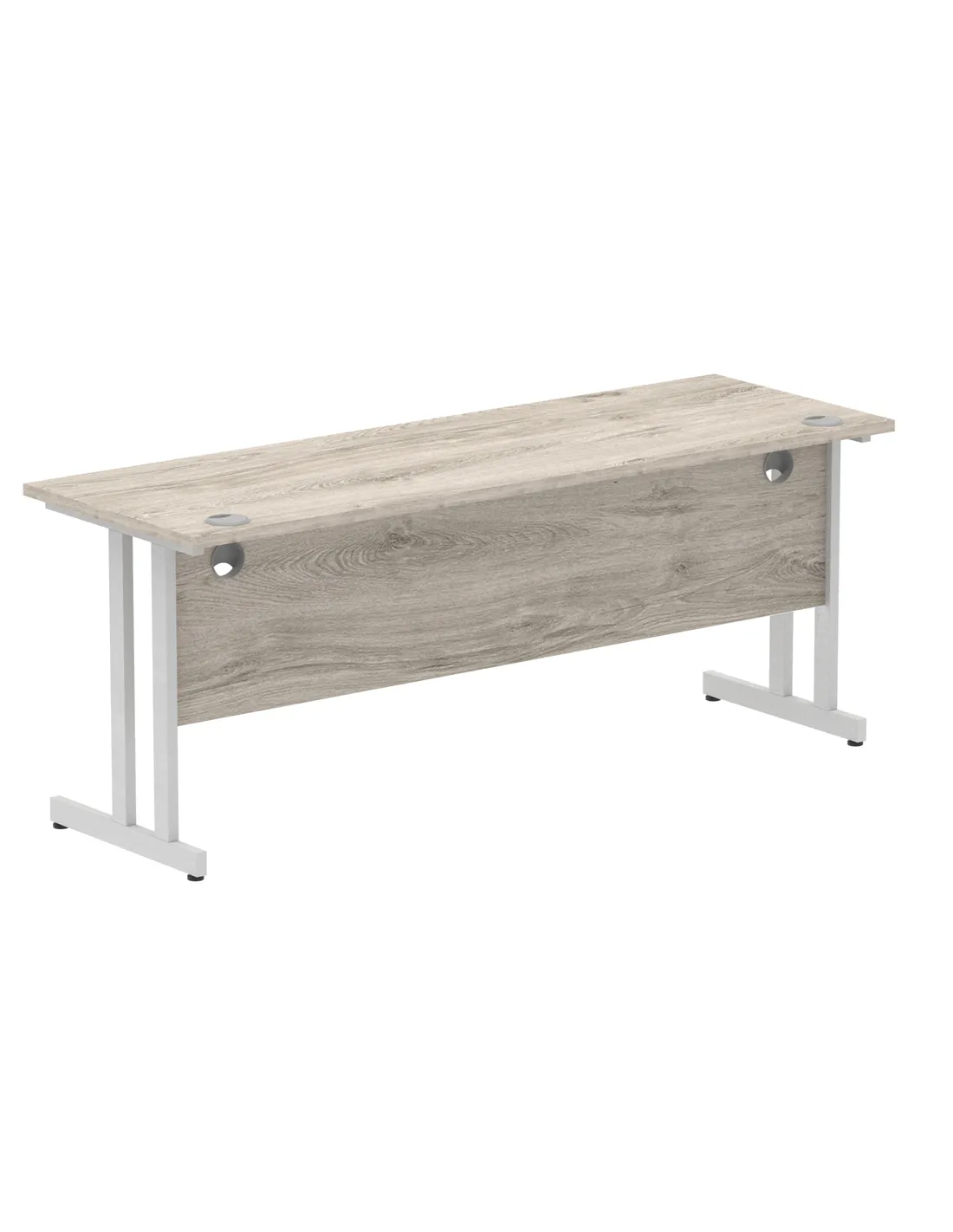 - This versatile desk is perfect for home offices, corporate workspaces, and study areas. Its spacious 1800mm width and durable Grey Oak melamine surface provide ample room for computers, paperwork, and office accessories. The silver cantilever legs add a modern touch, making it suitable for both professional and contemporary interiors.