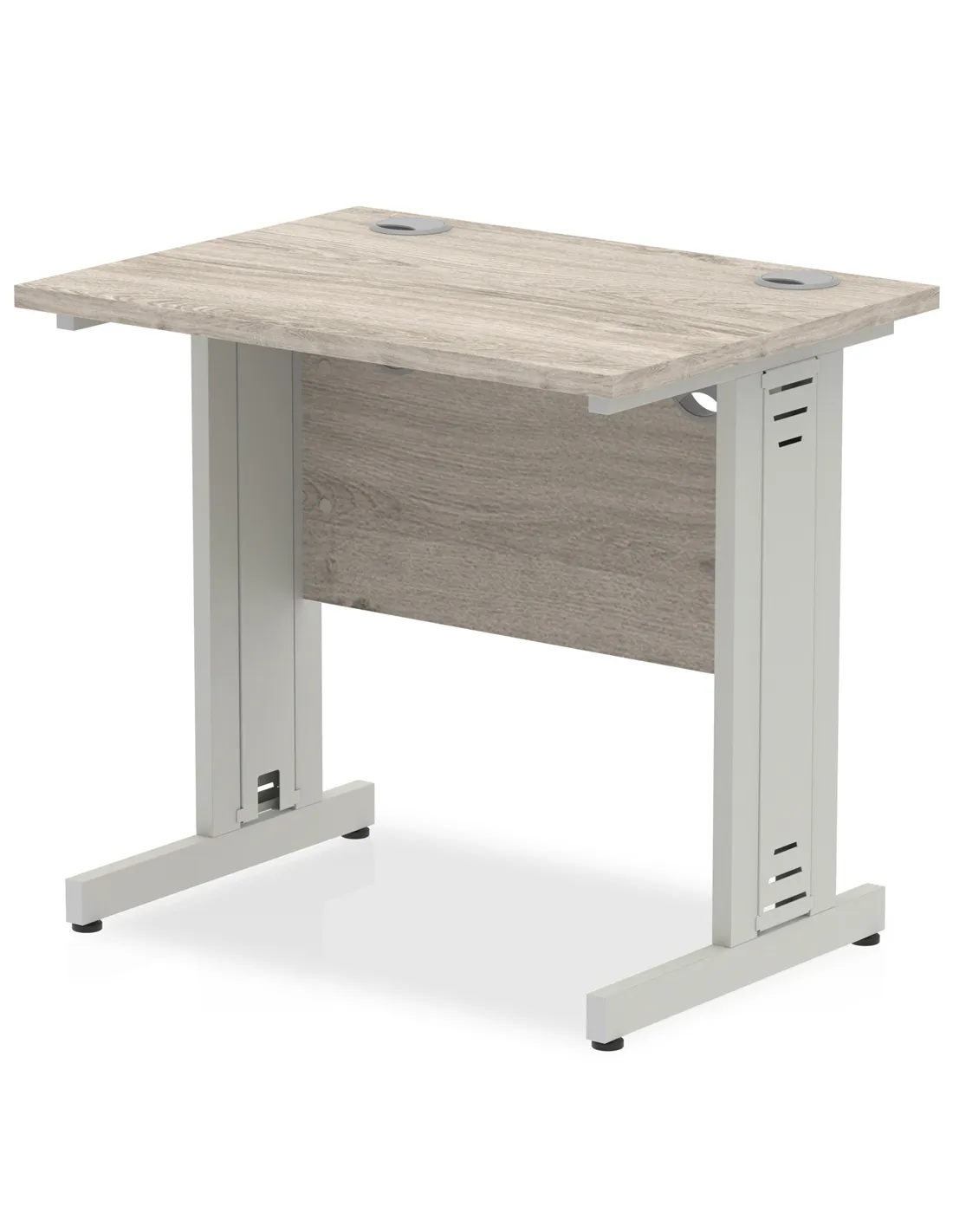 - This compact desk is perfect for home offices, small workspaces, or professional environments requiring efficient use of space. Its heat-resistant Grey Oak surface and cable-managed silver legs make it suitable for computer setups, paperwork, and meetings, blending style with practicality.
