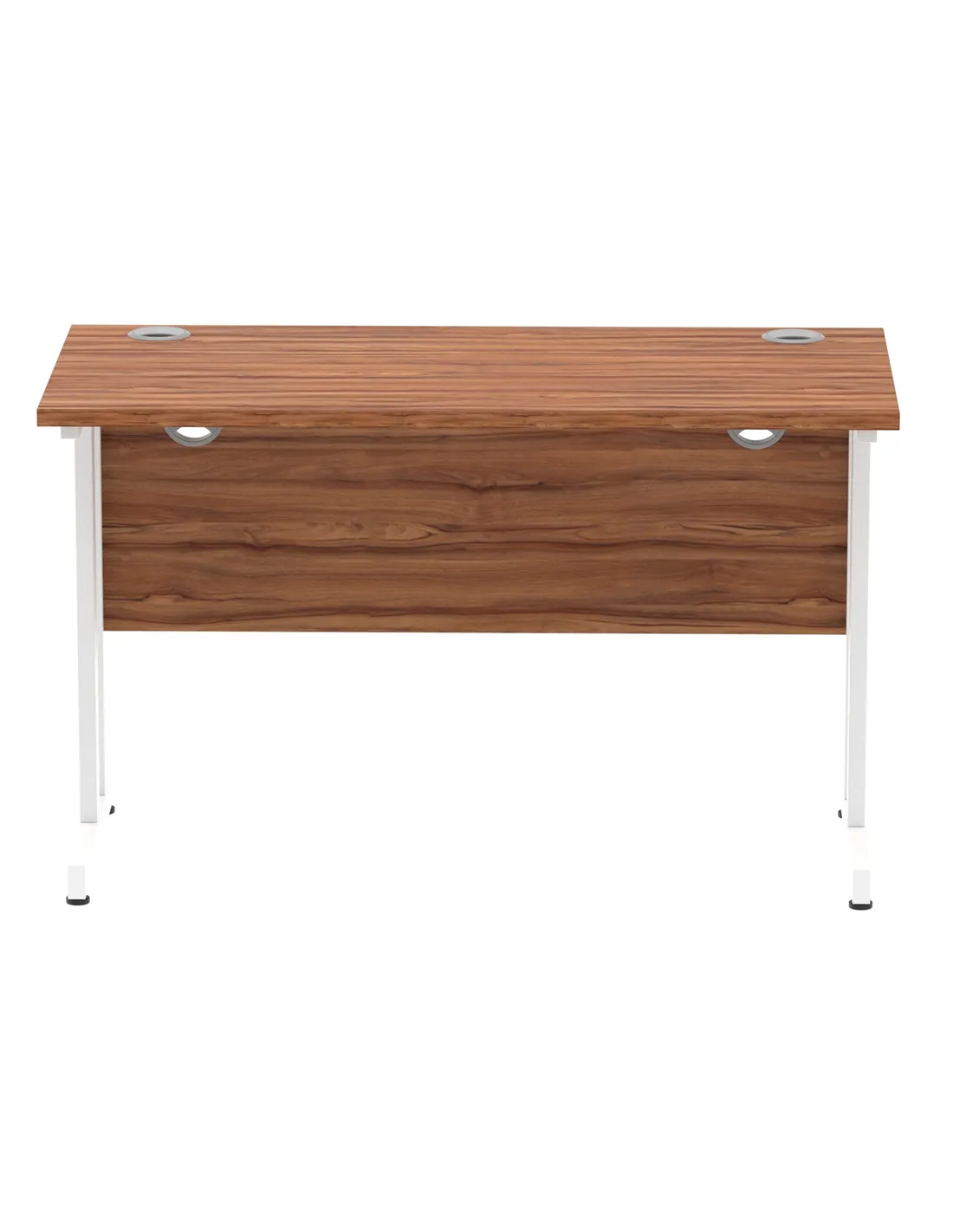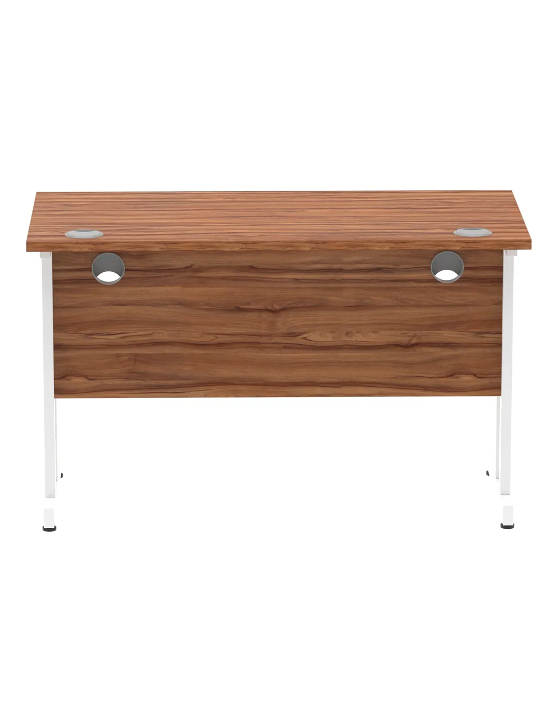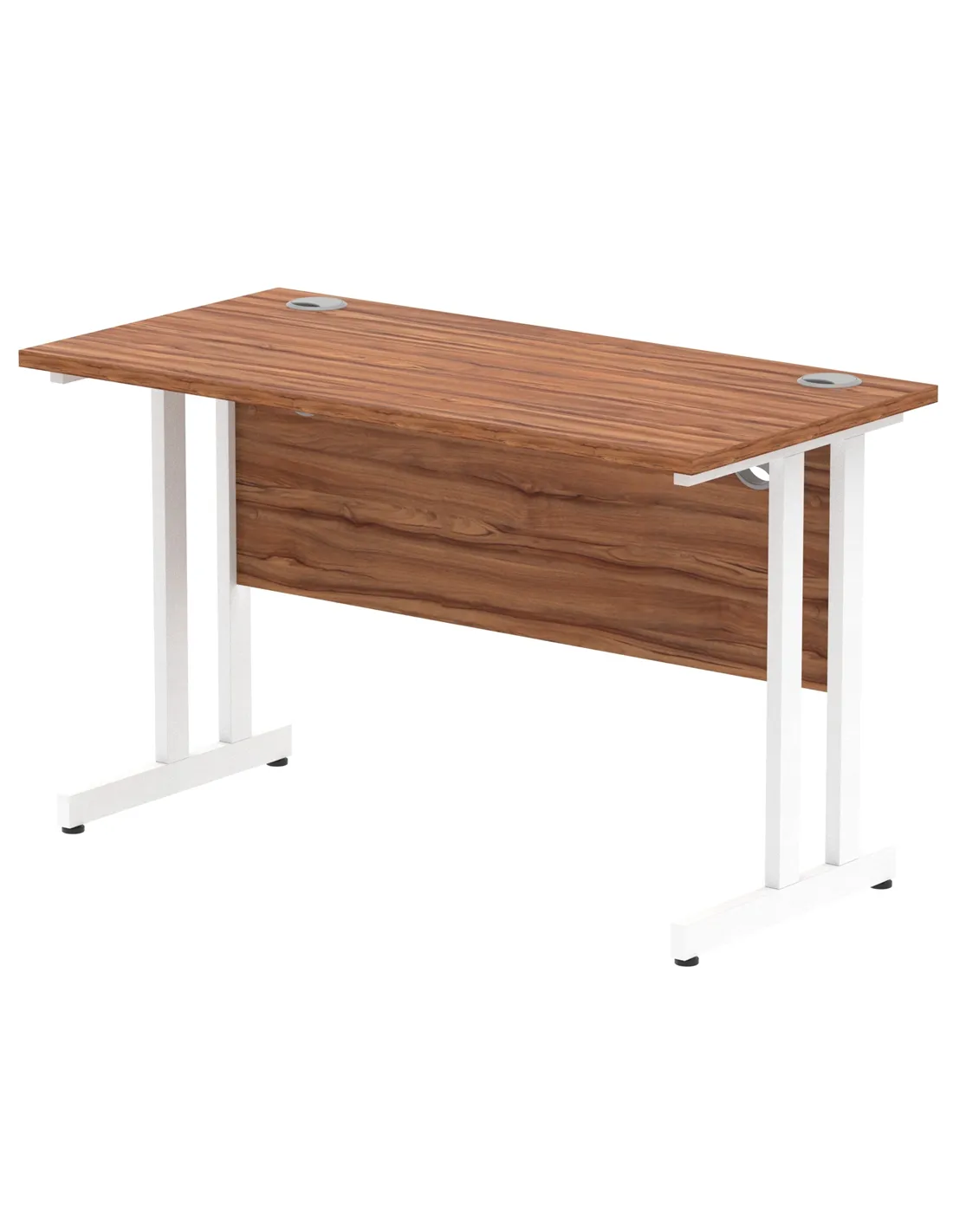 - Constructed with a 25mm thick heat-resistant walnut melamine top and robust steel cantilever legs, this desk supports up to 135kg. Its steel-to-steel fixings and height-adjustable feet enhance stability and longevity, making it a reliable choice for daily office use.