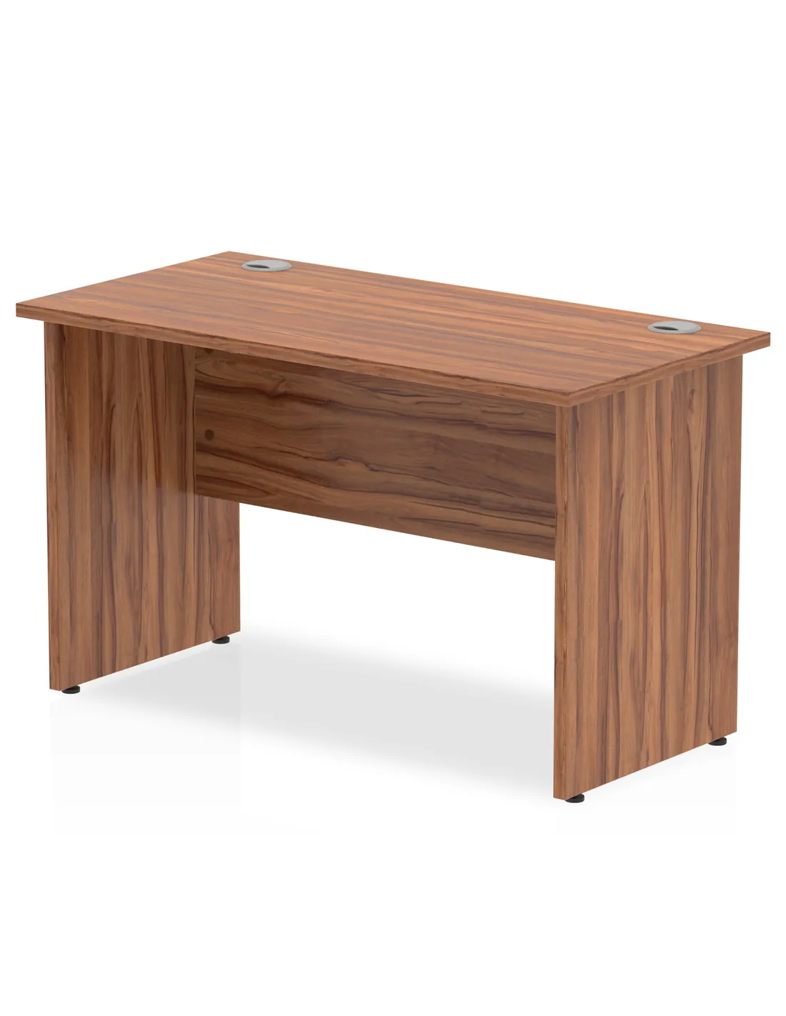 - This versatile office desk is perfect for home offices, corporate workspaces, and study areas. Its compact 1200mm width and 600mm depth make it suitable for rooms of various sizes, while the heat-resistant walnut finish adds a touch of elegance. The desk’s sturdy panel end legs and cable management ports support efficient organisation, making it ideal for computer setups, paperwork, and creative tasks.