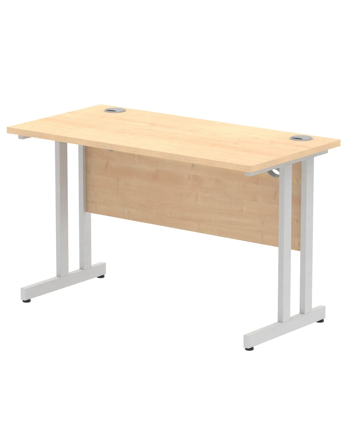- This versatile desk is perfect for home offices, corporate workspaces, and study areas. Its compact 1200 x 600mm surface with a heat-resistant maple finish suits both professional and personal environments, providing a stylish yet practical workspace. The silver cantilever legs add modern flair while ensuring stability, making it suitable for computer work, paperwork, or creative projects.
