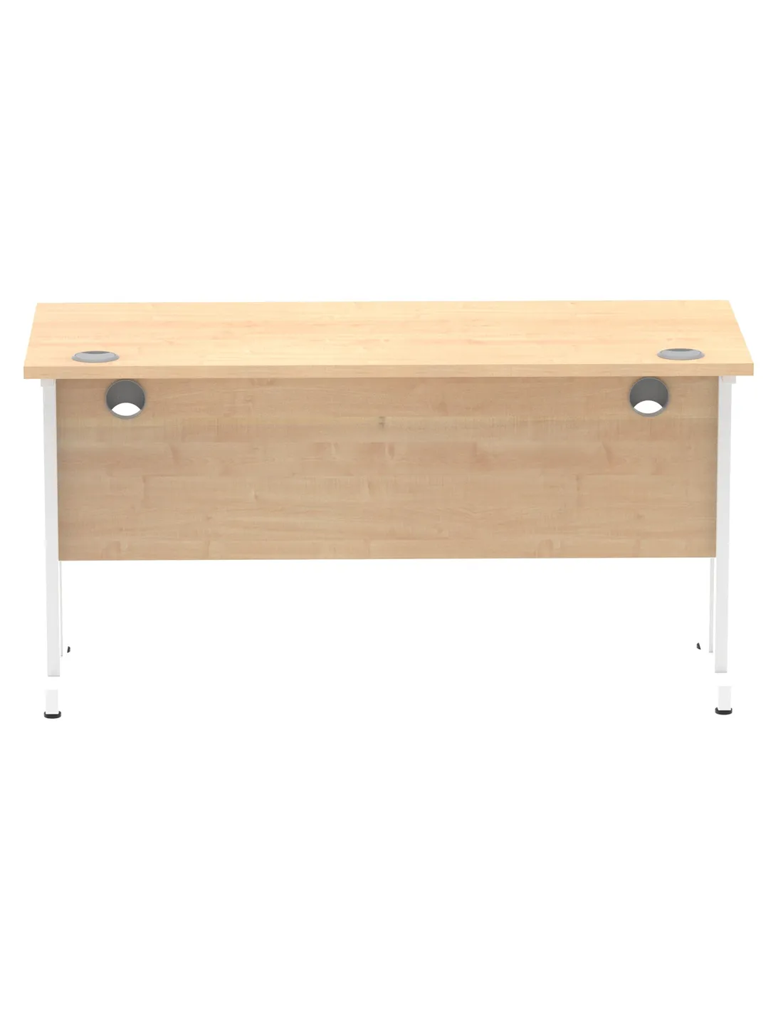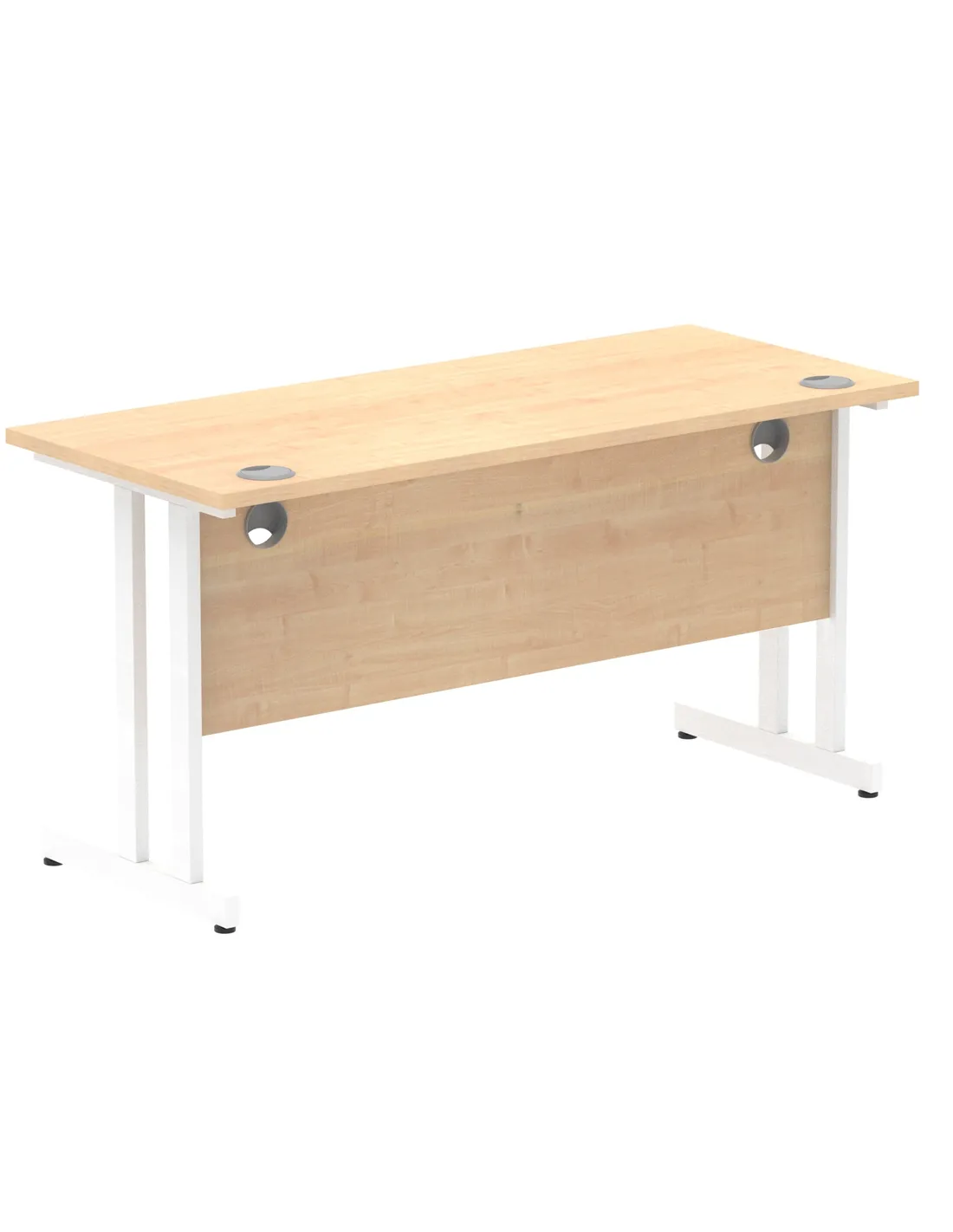 - This versatile desk is perfect for home offices, corporate workspaces, and study areas. Its compact 1400 x 600mm surface with a heat-resistant maple finish suits both professional and personal environments, offering ample room for computers, paperwork, and office accessories. The white cantilever legs add a modern touch, blending seamlessly with various interior styles.