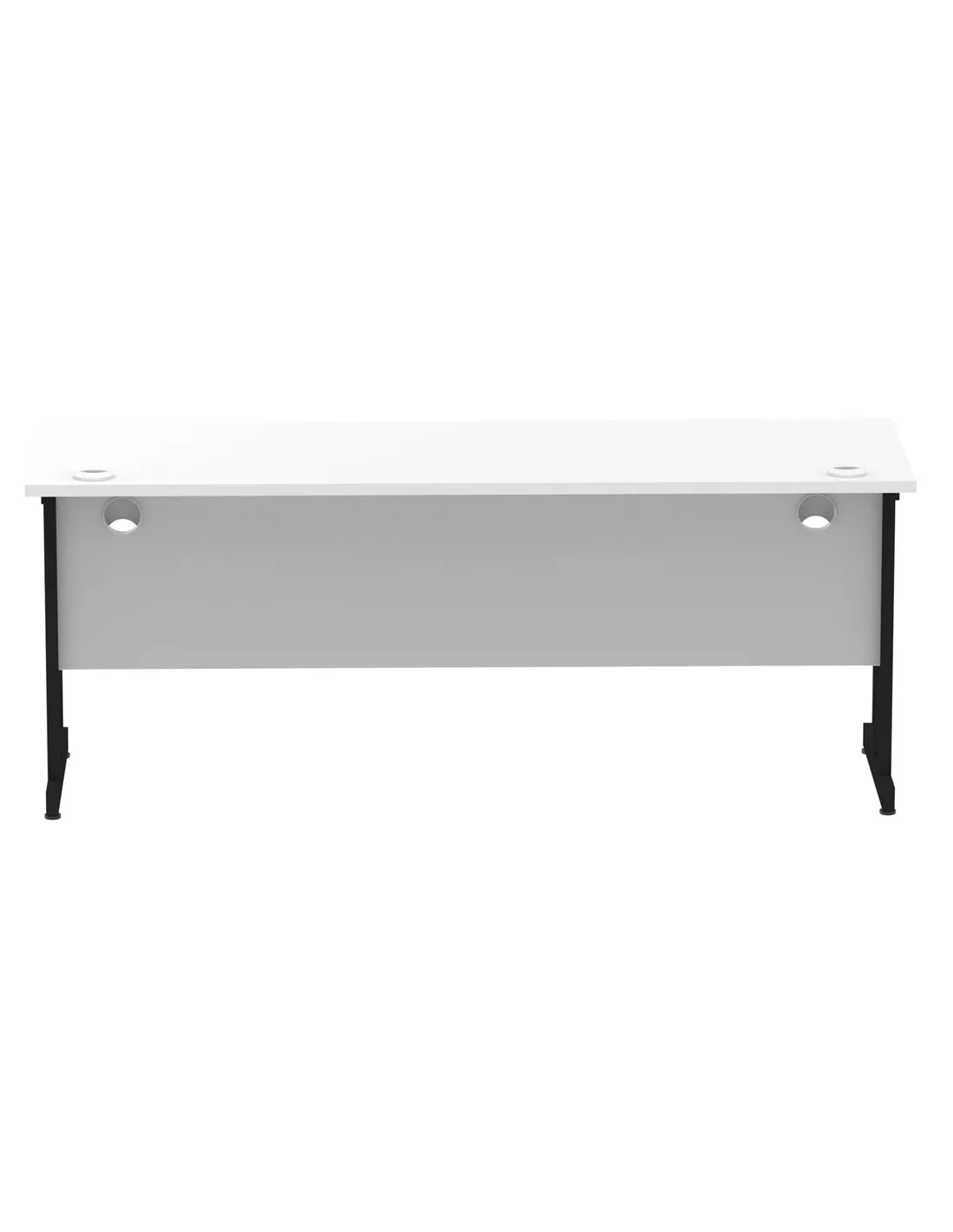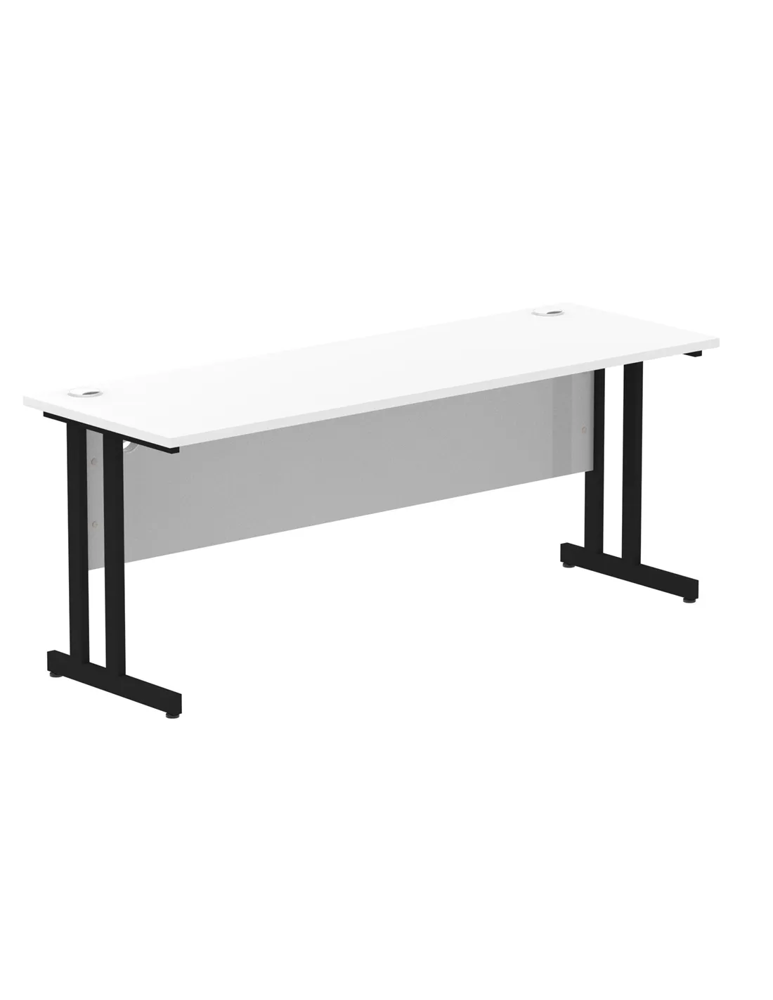 - This versatile desk is perfect for home offices, corporate workspaces, and study areas. Its spacious 1800mm width and durable white melamine surface provide ample room for computers, paperwork, and office accessories. The black cantilever legs add a modern touch, making it suitable for both professional and contemporary interiors.