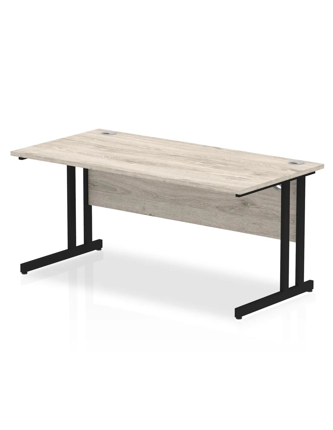 - This versatile desk is perfect for home offices, corporate workspaces, and study areas. Its spacious 1600mm width and durable Grey Oak melamine surface provide ample room for computers, paperwork, and office accessories. The sleek black cantilever legs add a modern touch, making it suitable for both professional and contemporary interiors.