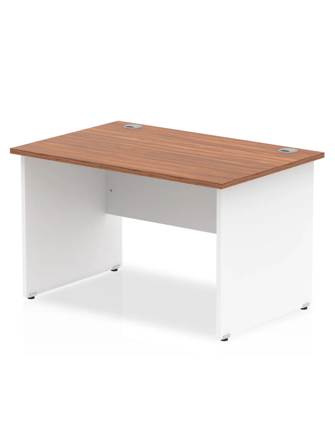 - This versatile office desk is perfect for home offices, small business workspaces, or professional environments requiring a compact yet functional workstation. Its straight rectangular design with a walnut top and white panel end legs complements modern interiors, providing a stylish and practical surface for computers, paperwork, and meetings.