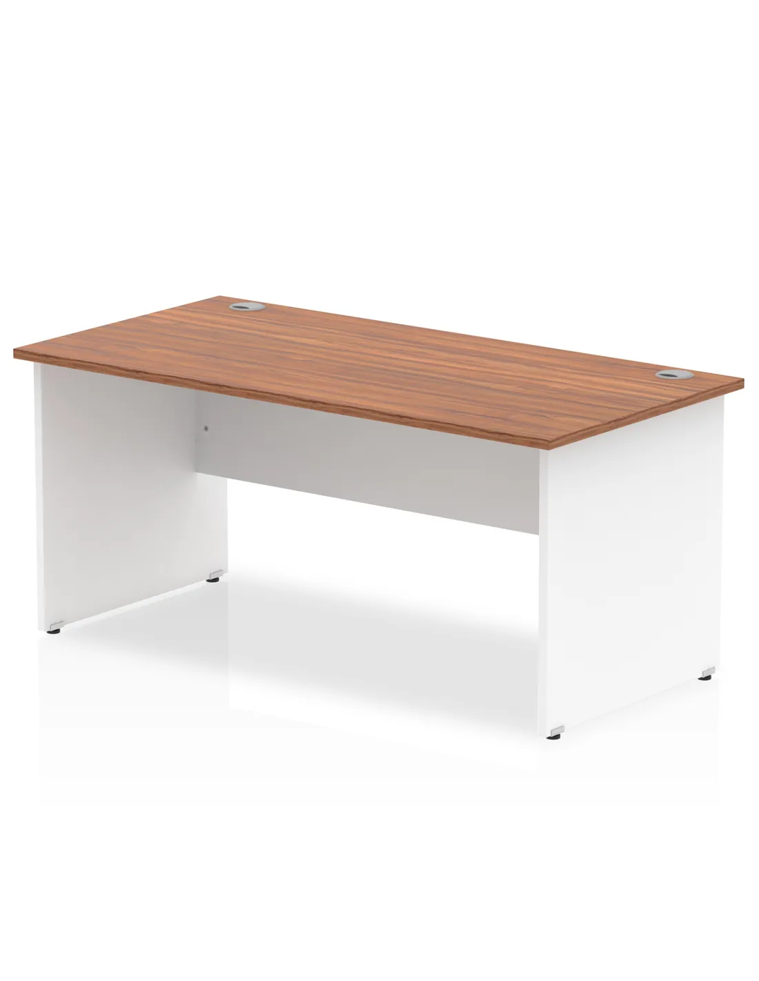- This versatile office desk is ideal for home offices, corporate workspaces, and study areas. Its spacious 1600mm width and durable walnut top with white panel legs provide a stylish yet practical surface for computers, paperwork, and meetings. The desk’s design supports screen clamp fittings, making it perfect for modern digital setups.