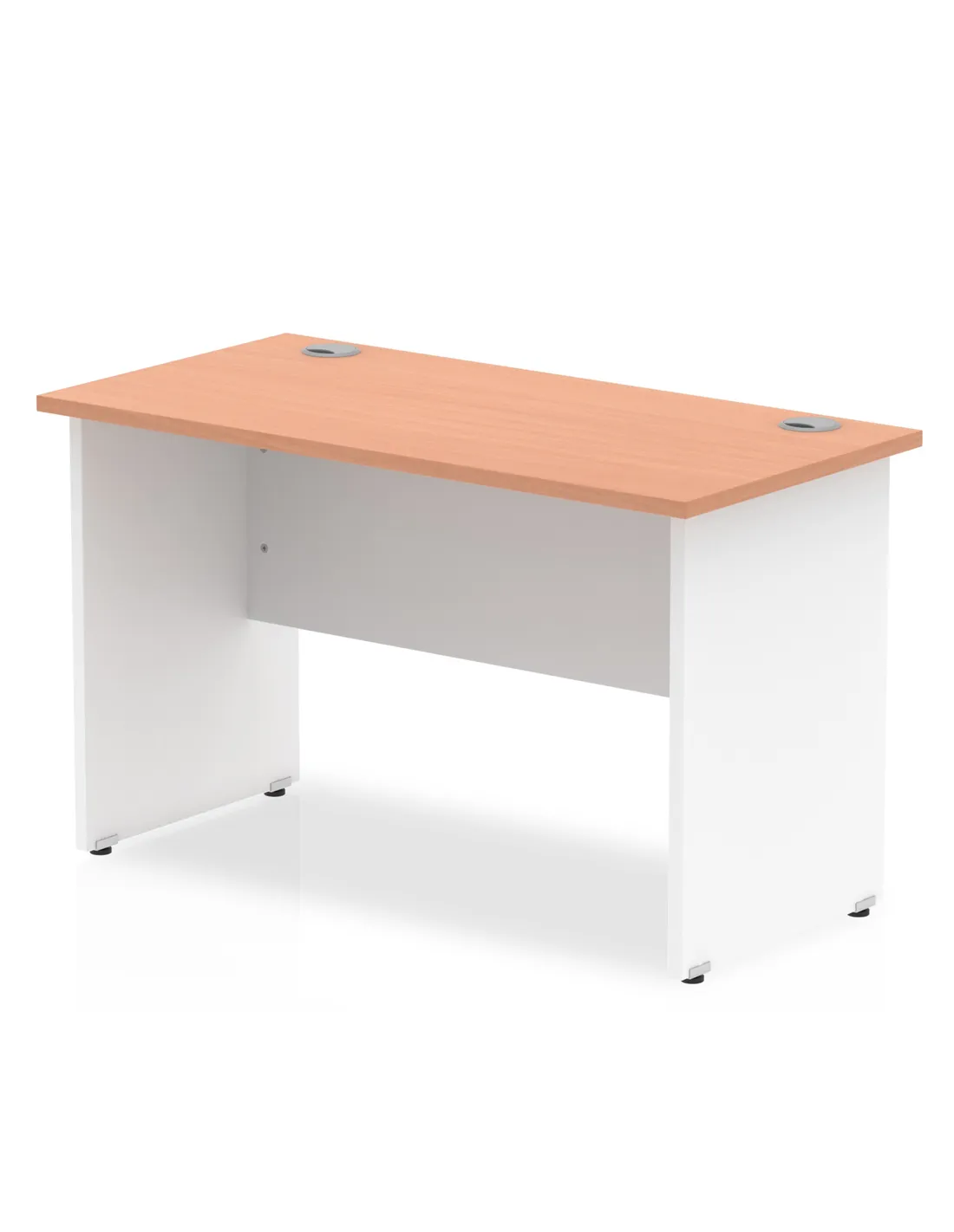 - This compact office desk is perfect for home offices, small workspaces, or professional environments requiring efficient use of space. Its beech top and white panel end legs offer a modern yet warm aesthetic, making it suitable for both contemporary and traditional interiors. The desk’s sturdy design supports computer setups, paperwork, and everyday office tasks with ease.