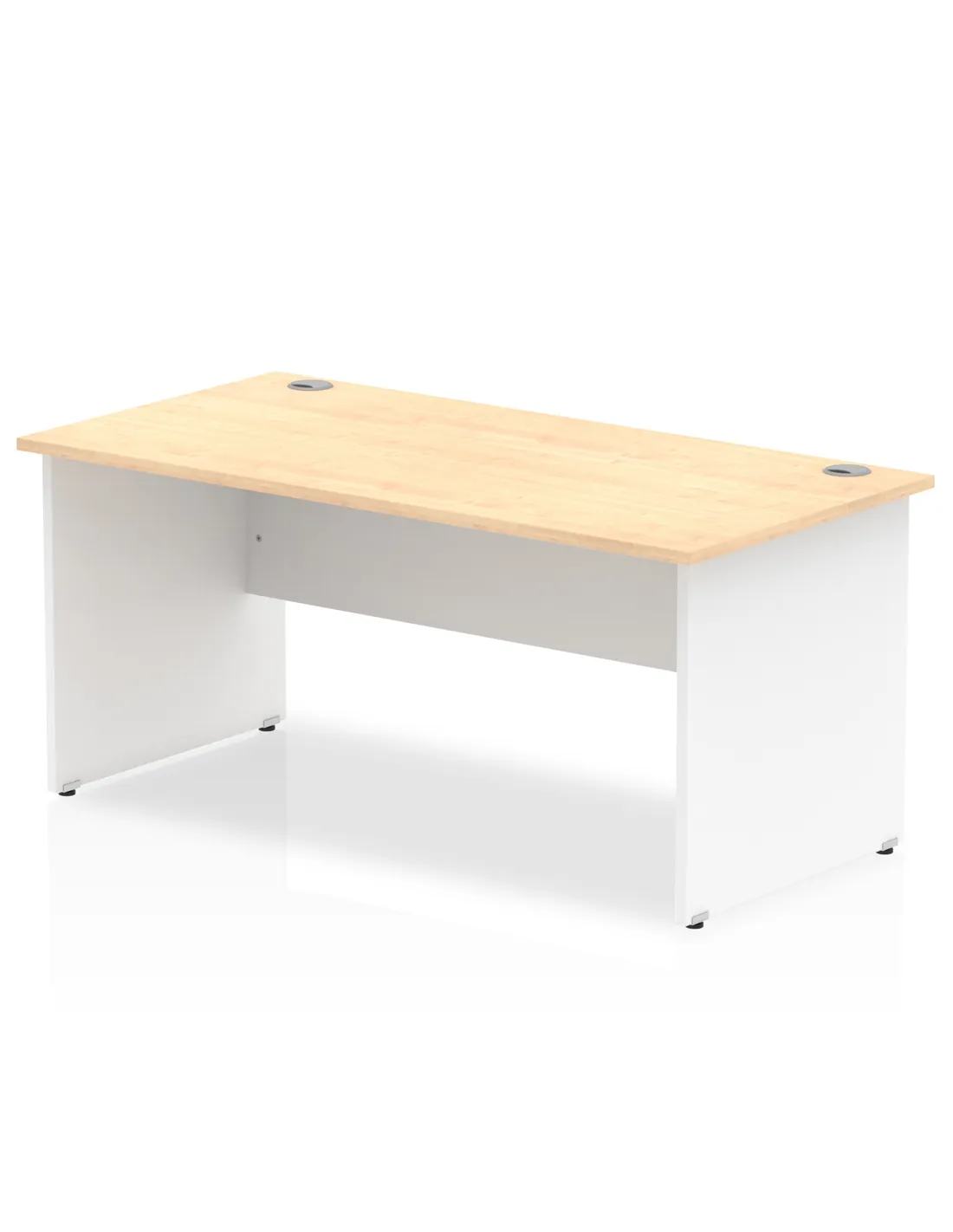 - This versatile office desk is perfect for home offices, corporate workspaces, and study areas. Its spacious 1600mm width and durable maple top provide ample room for computers, paperwork, and office accessories. The white panel end legs add a modern touch, making it suitable for both professional and contemporary interiors.