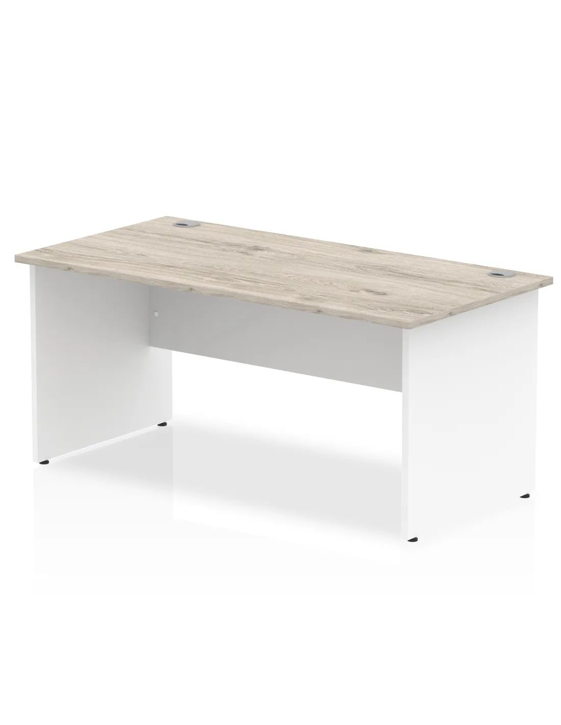- This versatile desk is perfect for home offices, corporate workspaces, and study areas. Its spacious 1600mm width and durable Grey Oak surface provide ample room for computers, paperwork, and office accessories. The clean, modern design with white panel end legs complements a variety of interior styles, making it a practical choice for both professional and personal environments.