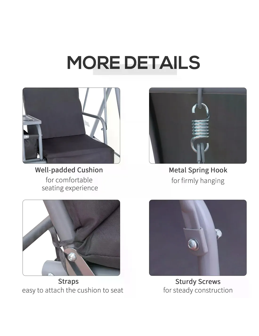 The Outsunny 2-seater swing chair with table is perfect for creating a cosy outdoor retreat in your garden, patio, or balcony. Ideal for enjoying a morning coffee or an evening chat with a friend, it also serves as a relaxing spot for reading or unwinding after a busy day. The integrated table with cup holders keeps essentials within easy reach, making it suitable for alfresco dining or casual drinks. Thanks to its sturdy steel frame and weather-resistant canopy, this swing chair is well-suited for year-round use, providing shelter from light rain, wind, and UV rays. Whether placed near a flower bed or beside your outdoor dining area, it adds both comfort and style to your outdoor living space.