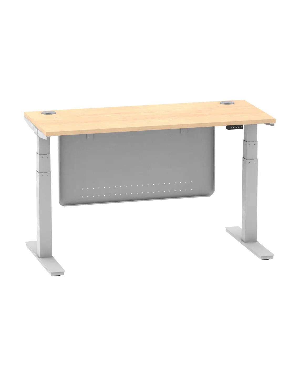 - Designed with versatility in mind, this desk features a smooth electronic dual motor system allowing effortless height adjustment from 660mm to 1310mm. Its sleek maple finish and modesty panel blend seamlessly into both professional and home environments, providing ergonomic comfort and privacy. The integrated cable ports help maintain a tidy workspace, ideal for remote working or office setups.