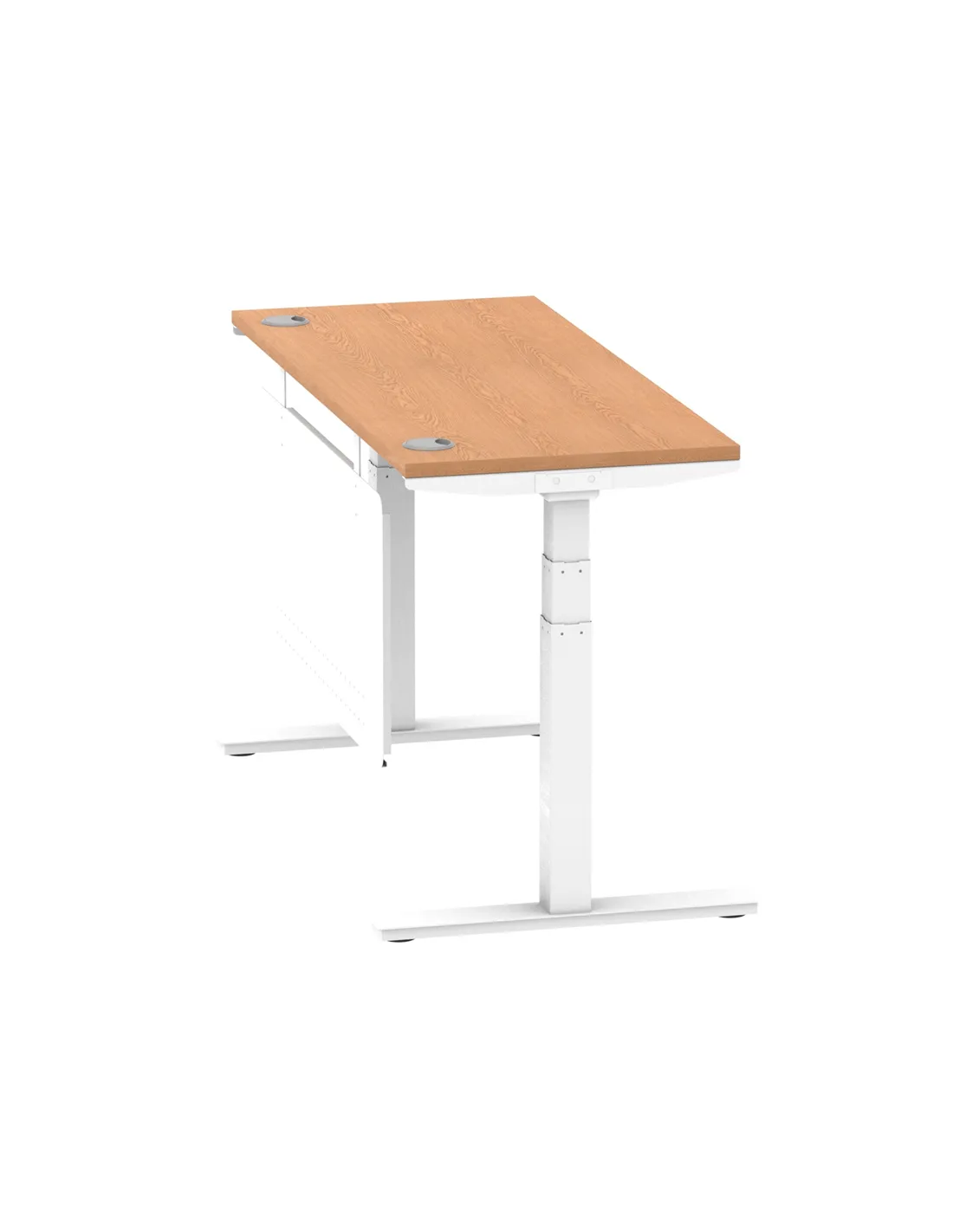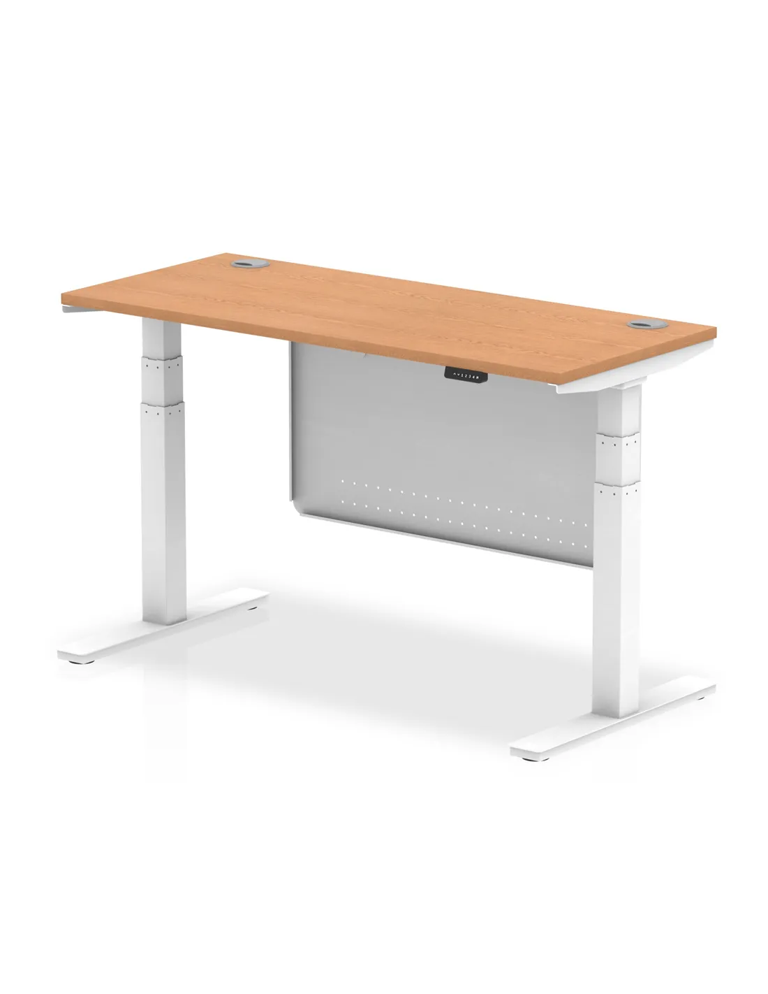 - The desk features smooth dual electronic motors and a wide height range (660-1310mm), allowing seamless transition between sitting and standing positions. Its oak finish and sleek steel modesty panel provide a professional yet stylish look, fitting perfectly in both modern home offices and corporate environments. Cable ports help keep wires organised, enhancing workspace tidiness.