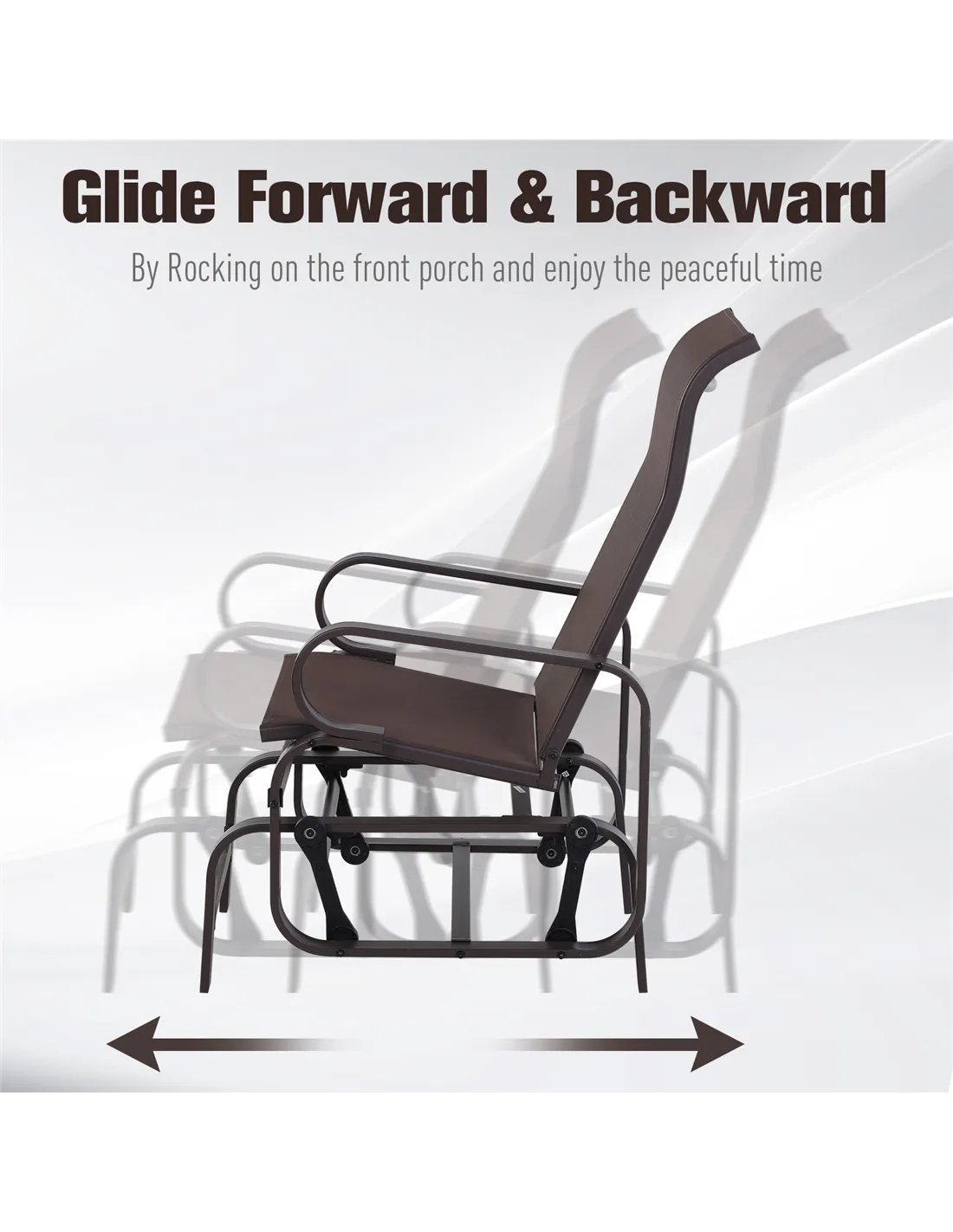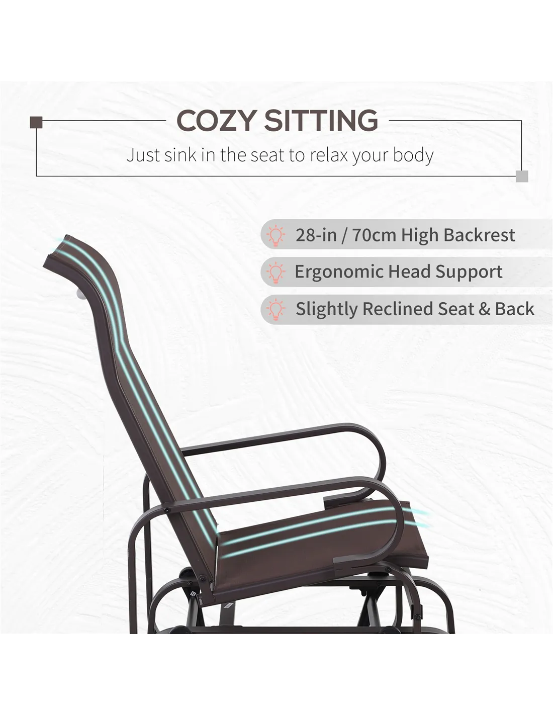 Don't just sit there. Glide into comfort with this Outsunny outdoor seat. The frame is made from metal for a tough structure, crafted into a forward/backward moving design; you can rock away gently - ideal for those lazy afternoons. The seat is made from fabric in a taut finish so it holds you comfortably and with support. The arms are wrapped in a protective shell, so you don't burn yourself on the metal when it's hot. Now where to relax? The choice is all yours...
