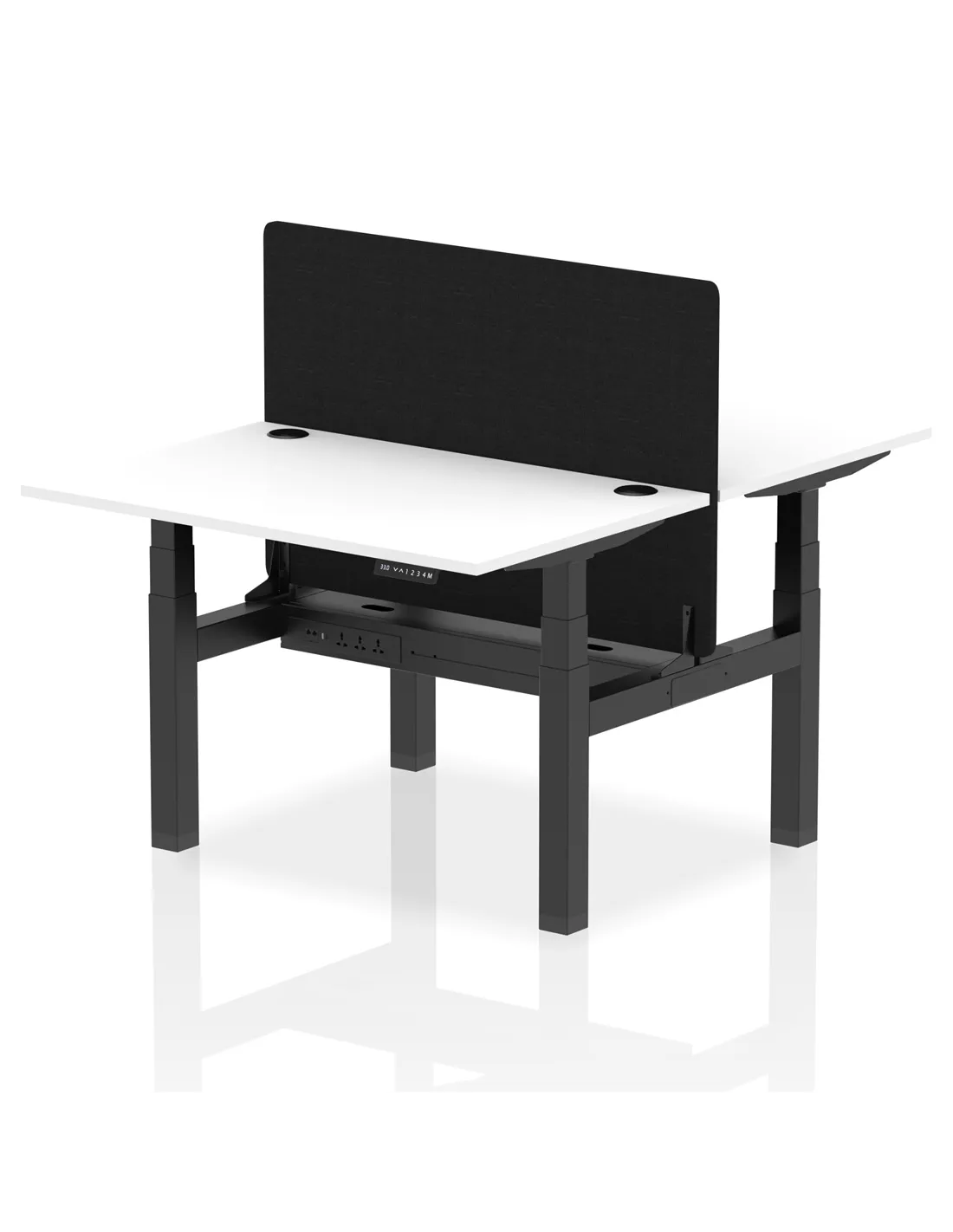 Elevate your office with the Air Back-to-Back Height Adjustable Desk for two, a blend of ergonomics and connectivity. Each desk includes two Ethernet ports, a USB and USB-C port, and three UK plugs, complemented by integrated cable ports for a clean setup. The addition of a straight screen offers privacy and focus. This desk is a perfect match for professionals seeking a tidy, tech-friendly, and adaptable workspace.