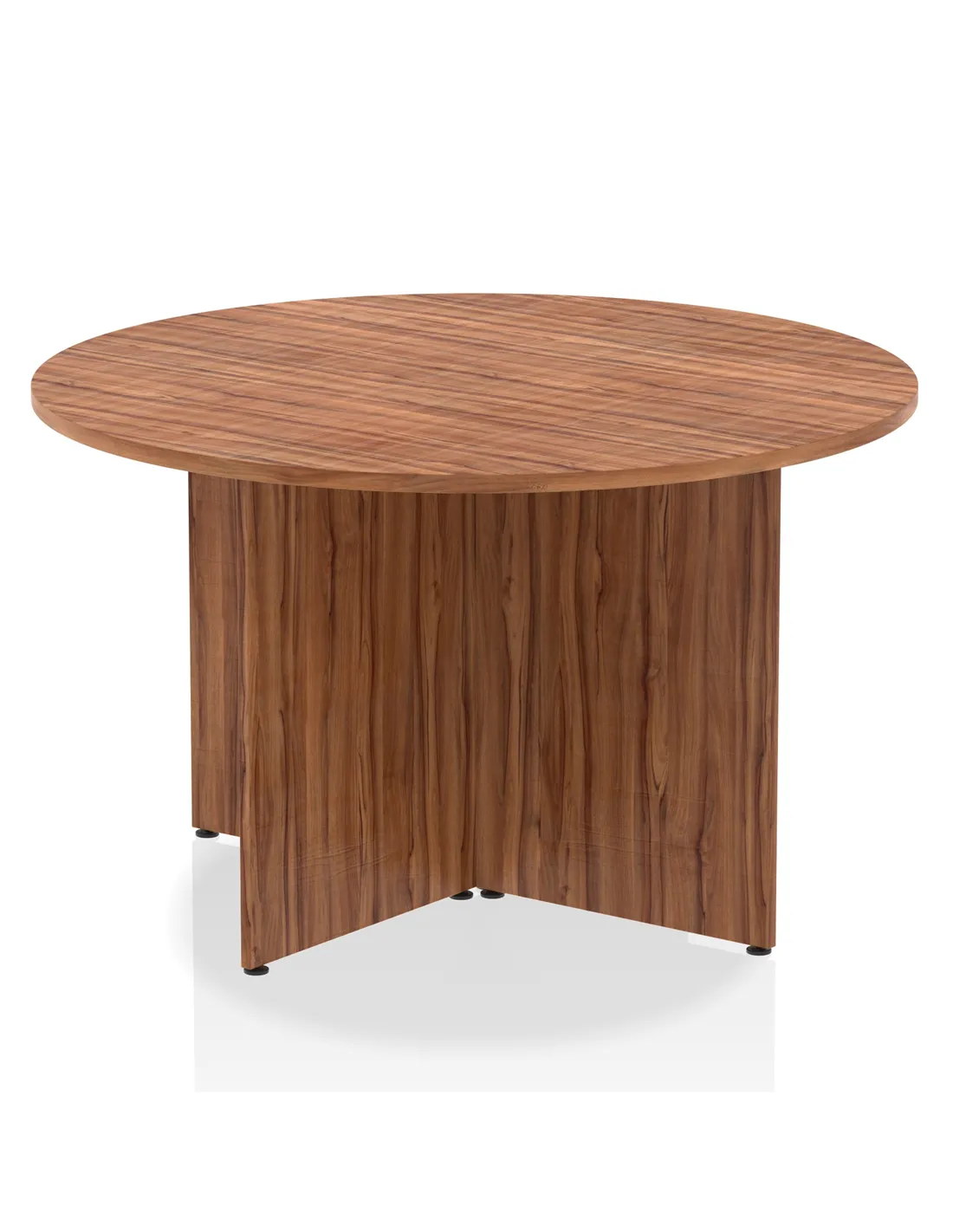 - This versatile table is perfect for collaborative office spaces, meeting rooms, and breakout areas. Its 1200mm circular walnut top and distinctive arrowhead legs create a stylish yet functional setting, ideal for team discussions or casual work sessions. It also fits well in home offices or dining areas, adding a touch of modern elegance.