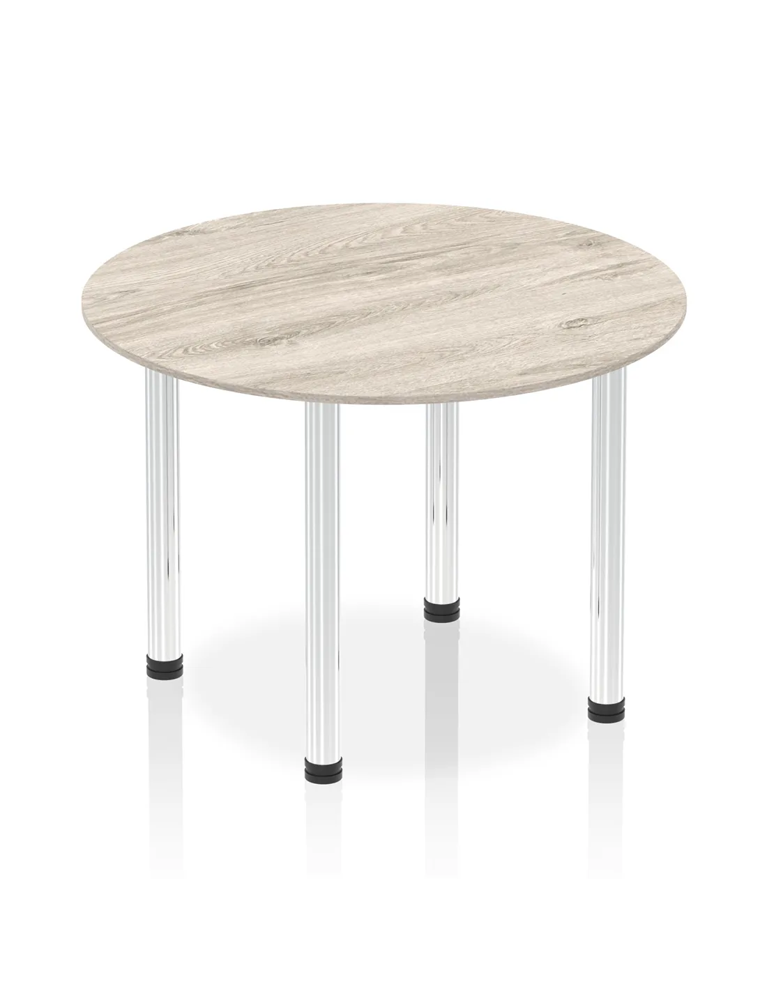 - This versatile round table is perfect for collaborative office spaces, meeting rooms, or breakout areas. Its compact 1000mm diameter and sturdy design create an inviting environment for team discussions, client meetings, or casual work sessions. The elegant grey oak finish combined with chrome post legs complements modern interiors, making it suitable for both professional and home office settings.
