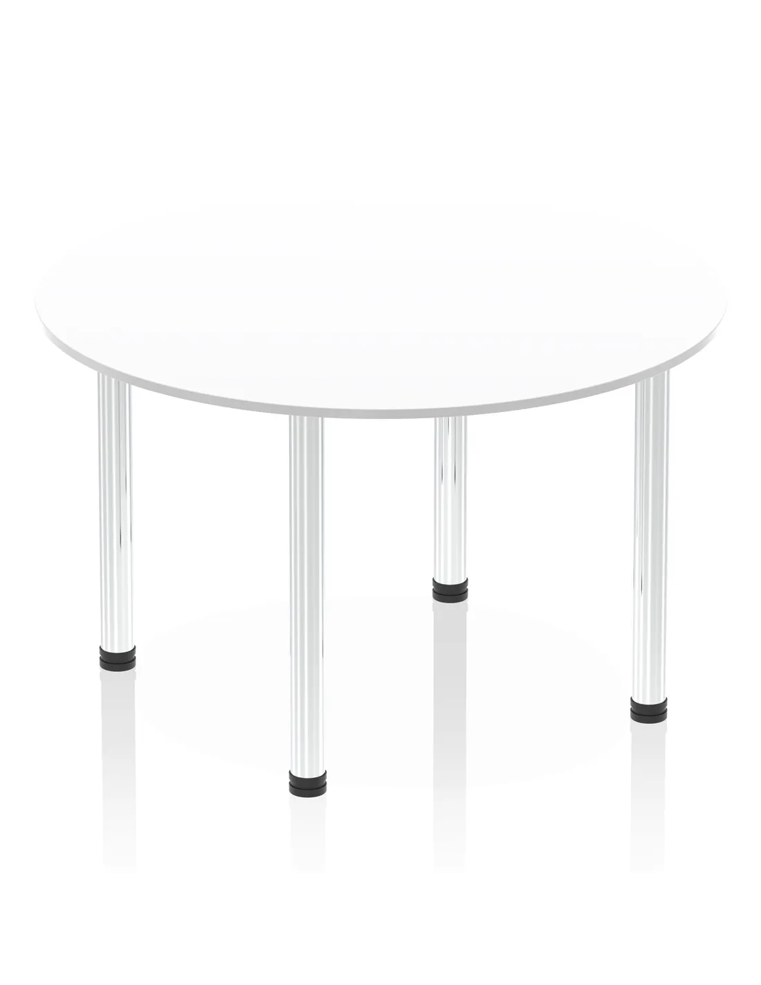 - This versatile round table is perfect for collaborative workspaces, meeting rooms, and breakout areas. Its 1200mm diameter offers ample space for team discussions or casual meetings, while the sleek white top and chrome post legs complement modern office or home environments. Customers often use it as a stylish dining or conference table, enhancing both functionality and aesthetics.