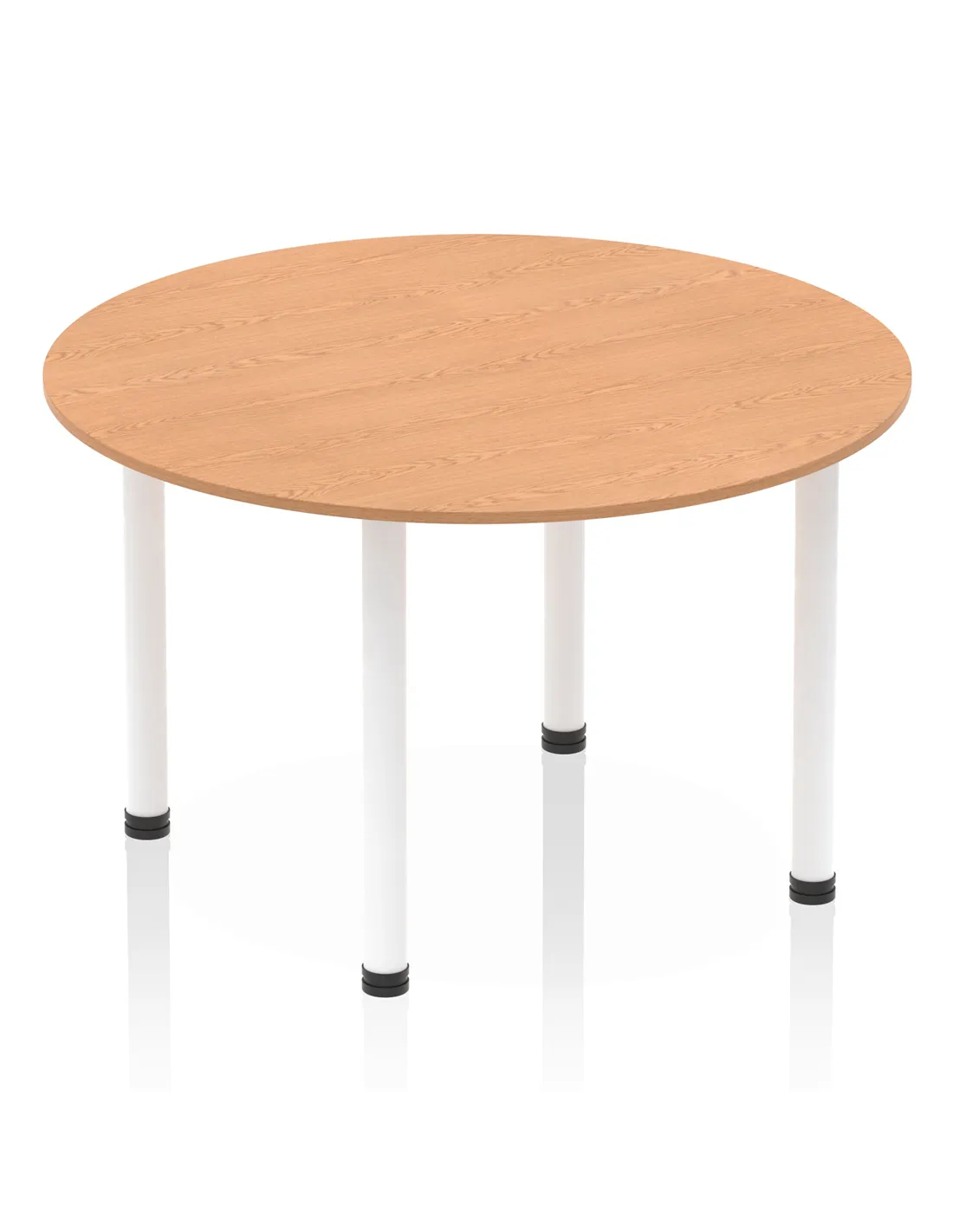 - This versatile round table is perfect for collaborative office spaces, meeting rooms, and breakout areas. Its oak finish and white post legs create a modern yet warm atmosphere, making it equally suitable for home offices or stylish dining nooks. The 1200mm diameter offers ample space for team discussions or casual gatherings, enhancing productivity and comfort.