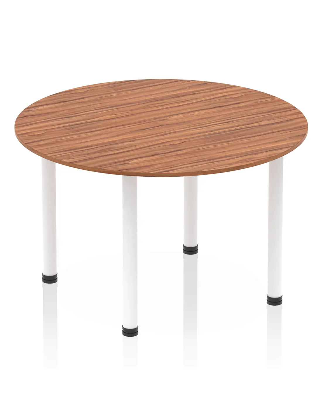 - This versatile round table is perfect for collaborative workspaces, meeting rooms, and breakout areas. Its 1200mm diameter offers ample space for team discussions or casual meetings, while the warm walnut finish and white post legs complement modern office or home environments. Customers often use it as a stylish dining or conference table, enhancing both functionality and aesthetics.
