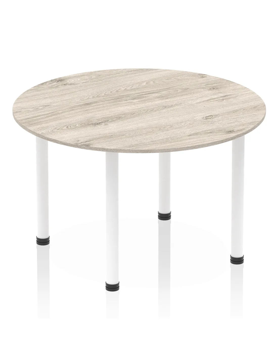 - This versatile round table is perfect for collaborative workspaces, meeting rooms, or home offices. Its 1200mm diameter offers ample space for team discussions or individual tasks, while the stylish grey oak finish and white post legs complement modern interiors, creating a professional yet welcoming environment.