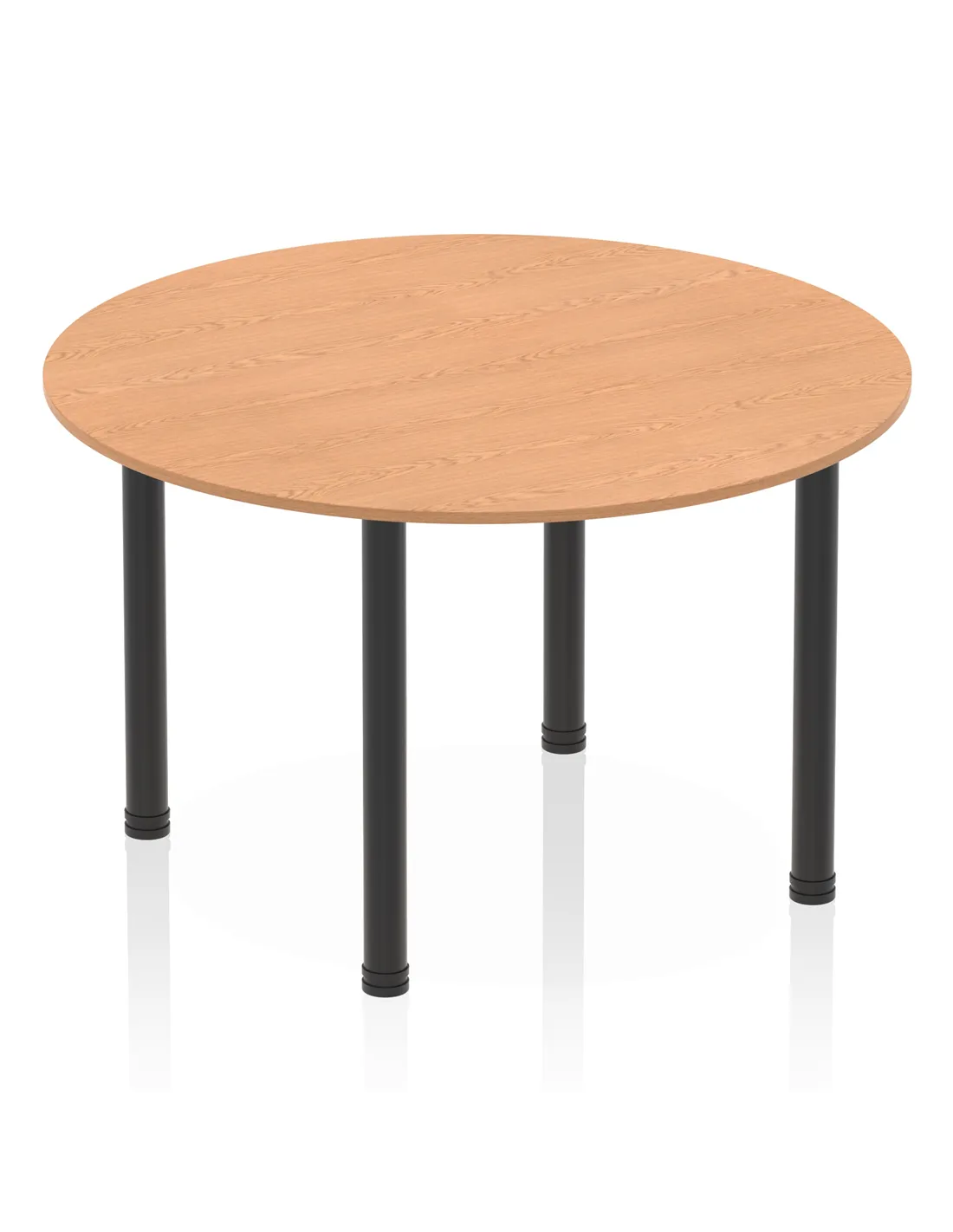 - This versatile round table is perfect for collaborative office spaces, meeting rooms, and breakout areas. Its 1200mm diameter offers ample surface for team discussions, casual meetings, or as a stylish addition to a home office or dining nook. The oak finish combined with black post legs complements modern interiors, creating a professional yet welcoming atmosphere.