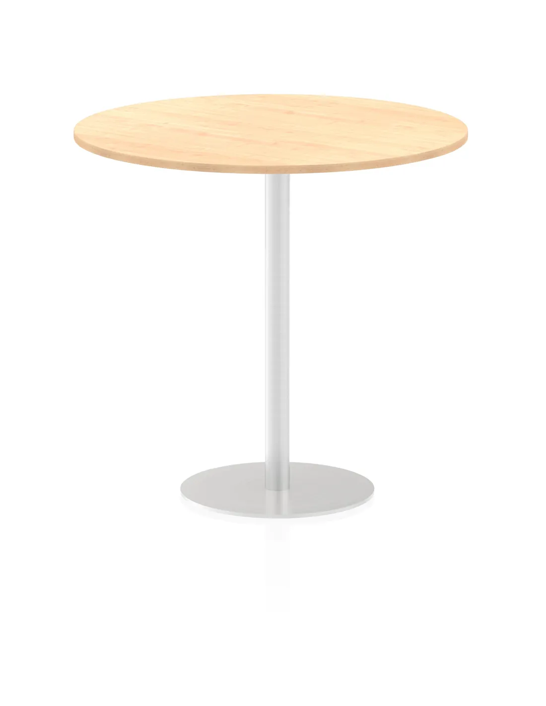 - Featuring a weighted brushed stainless steel circular base and robust 25mm thick maple-effect melamine top, this table offers excellent stability and resilience. The brushed steel pillars and trumpet base design not only provide strength but also prevent any leg or knee traps, enhancing user comfort.