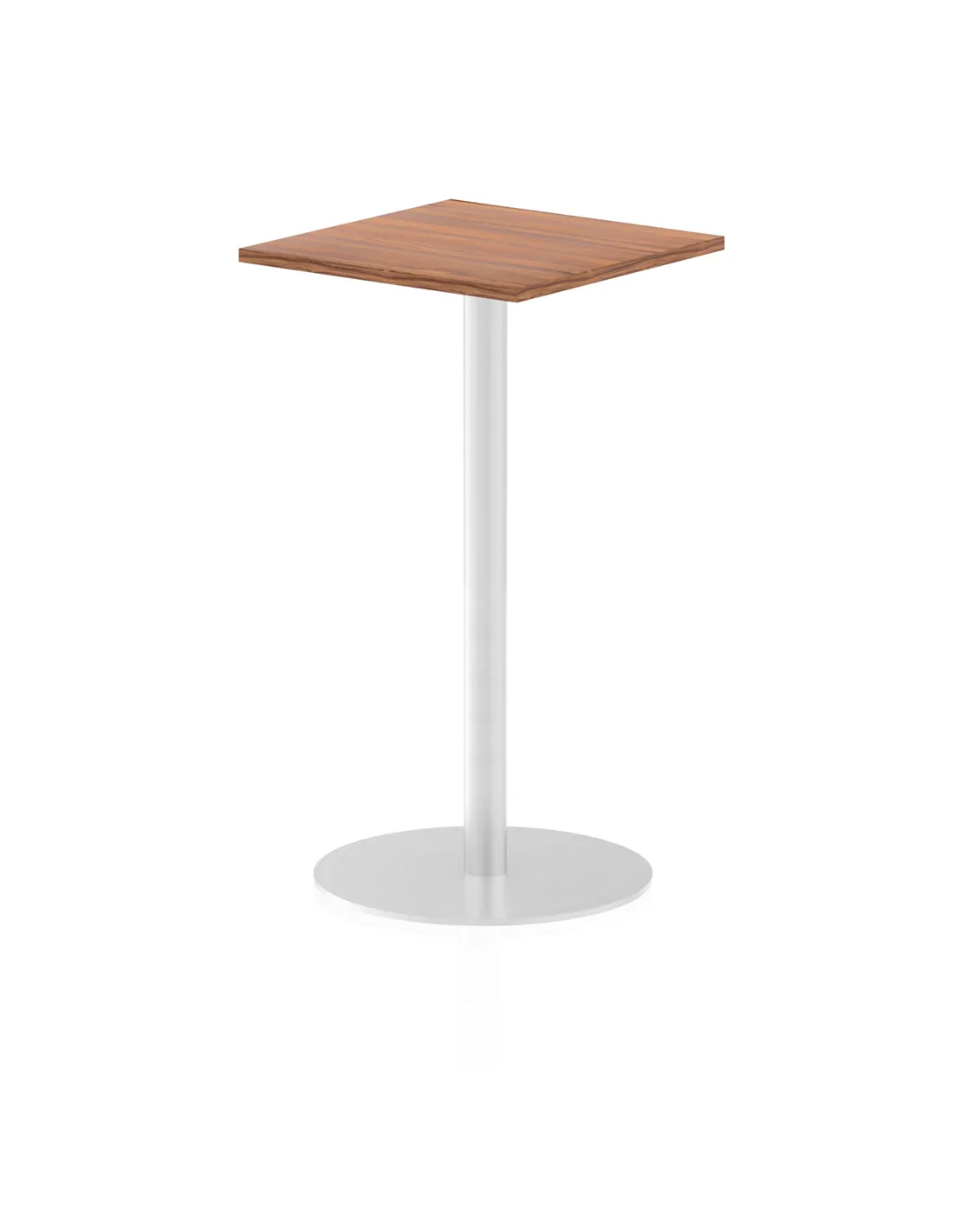 - This stylish poseur table is perfect for a variety of environments including meeting rooms, conference areas, boardrooms, and dining spaces. Its compact 600mm square walnut top and 1145mm high legs make it an excellent choice for standing discussions or casual dining, blending functionality with modern design.