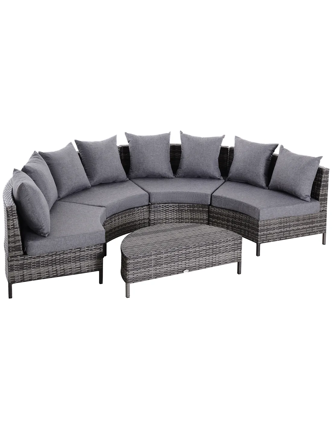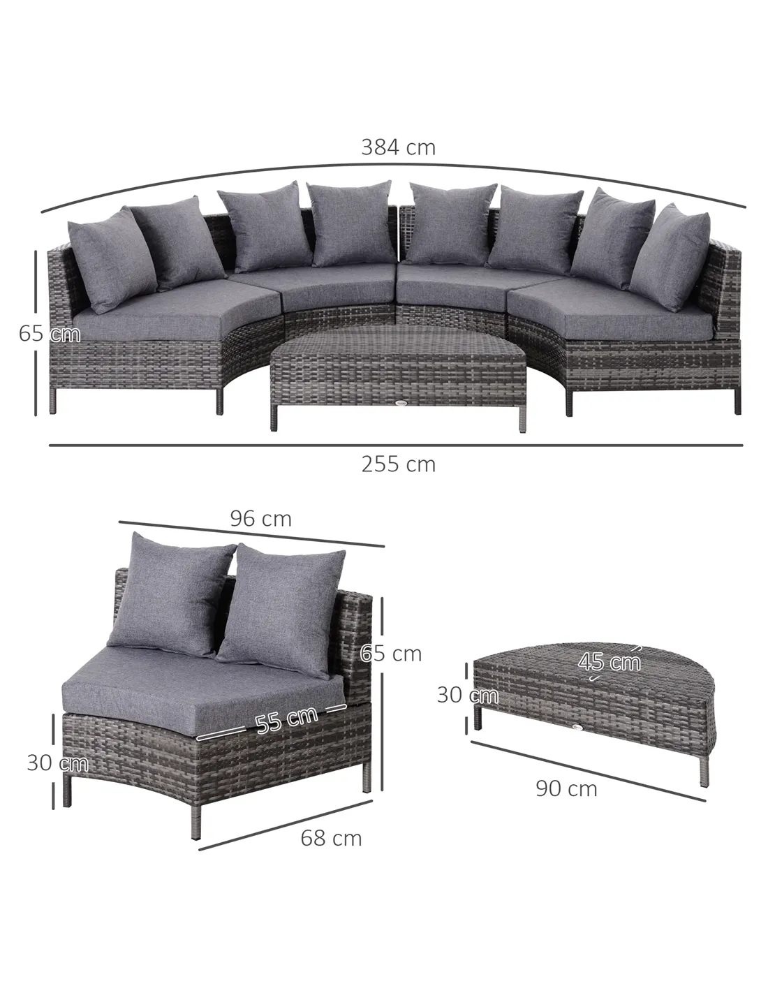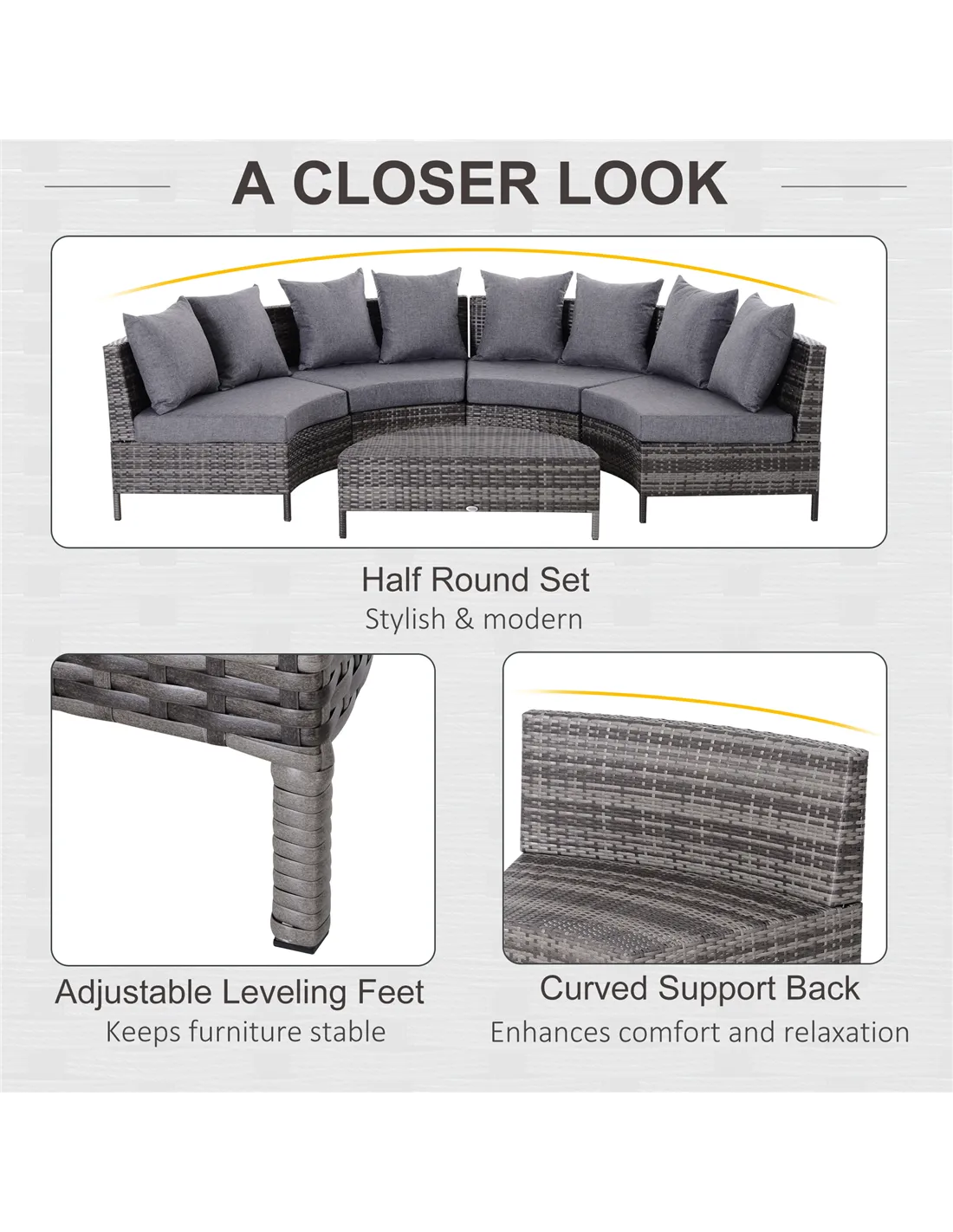 Outsunny 5 Pieces Rattan Garden Furniture Set, 4 Seater Half-Round Garden Sofa Set with Thickened Cushions, Wicker Conservatory Furniture with 4 Chairs, Rattan Coffee Table and Pillows, Grey