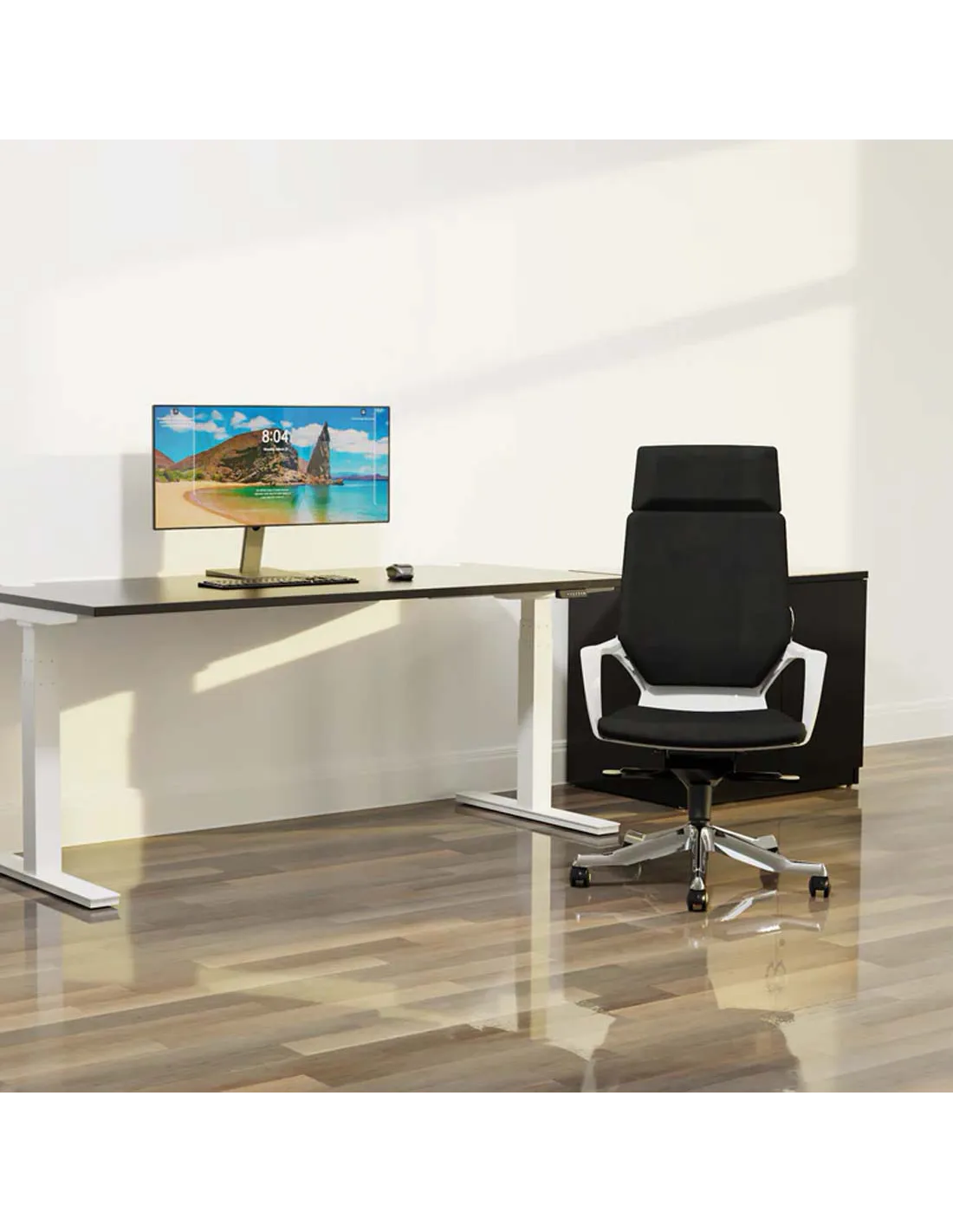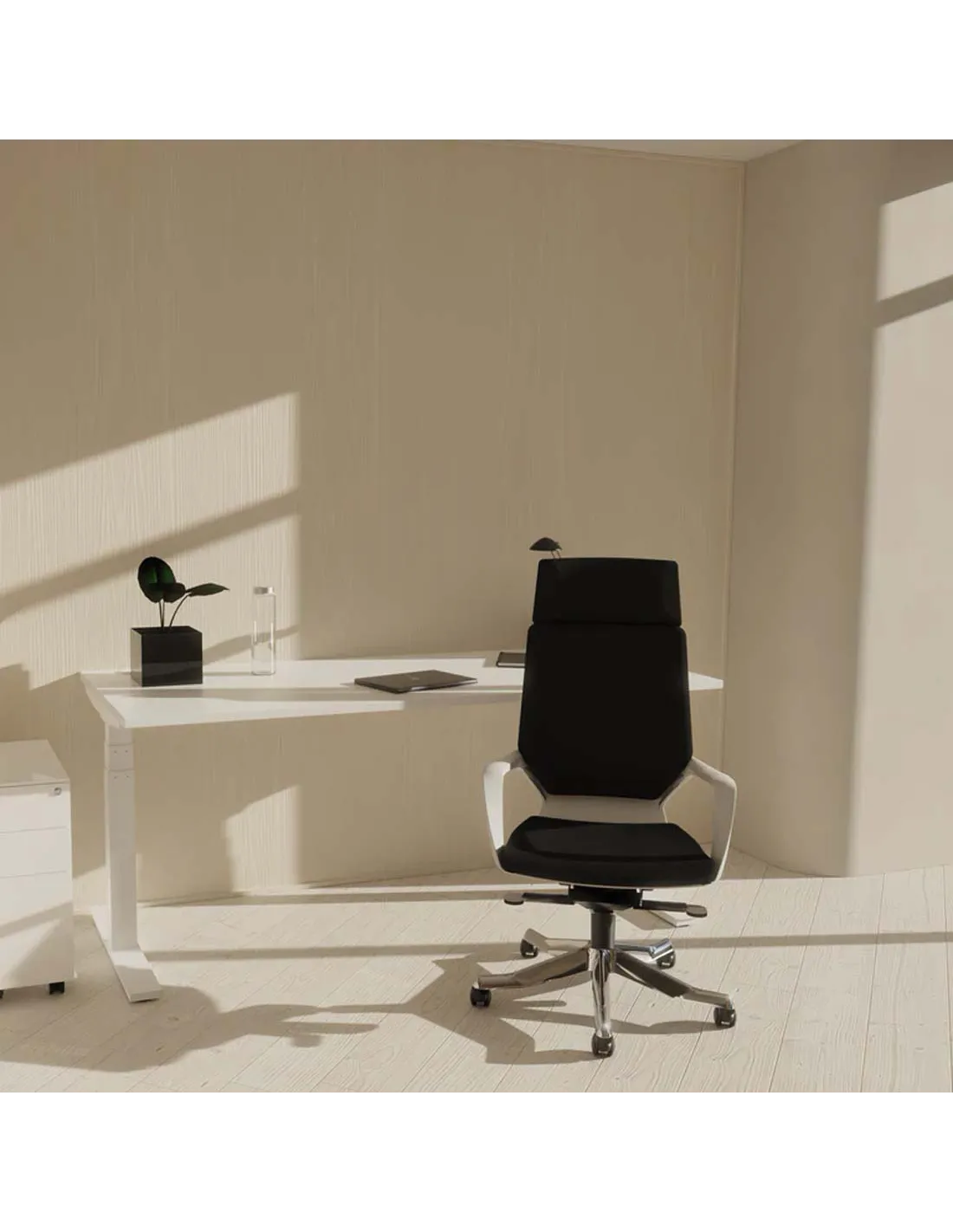 Featuring a high backrest upholstered in premium black fabric, the chair offers integral lumbar support and a fixed headrest for sustained comfort during long working hours. The one-piece design seamlessly integrates the seat, backrest, and armrests, all supported by a durable brushed aluminium five-star base. The advanced knee tilt mechanism with adjustable tension ensures personalised comfort while promoting healthy circulation.
