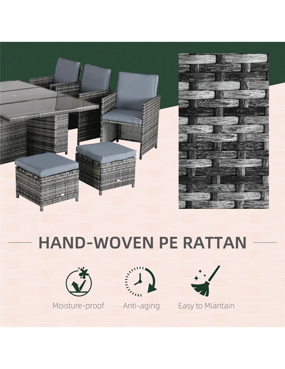 The Outsunny 11 pieces garden dining furniture set creates an inviting setting, ideal for patio, porch, poolside, and garden. The rattan cube dining sets is designed from a beautiful wicker material on a reinforced aluminum frame. The wicker and tempered glass table of the rattan garden dining set looks very fashionable and creates a modern style for your outdoor living area. The rattan cube dining set is suitable for any occasion, family dinners, parties, and more.