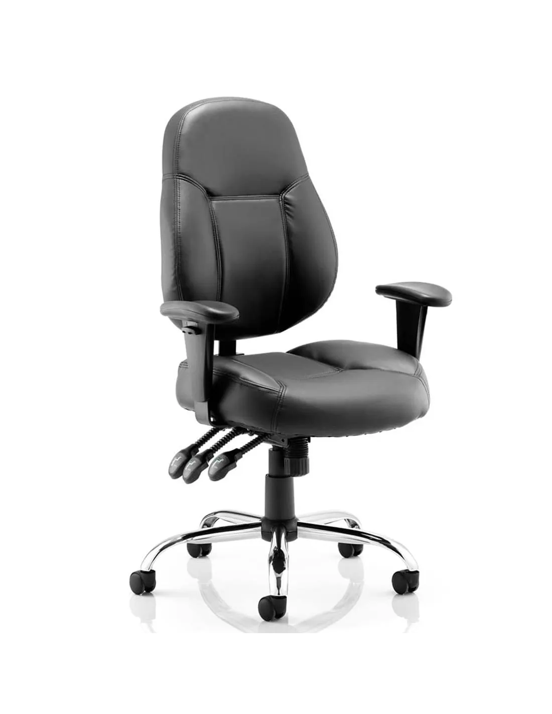 The storm is a firm favourite in the Dynamic range. It has an array of functions whilst maintaining a solid build quality. The deeply cushioned seat and backrest are upholstered with a durable Soft Bonded Leather and finished with a simple stitch detail. Height adjustable arms and 5 star chrome base are included.