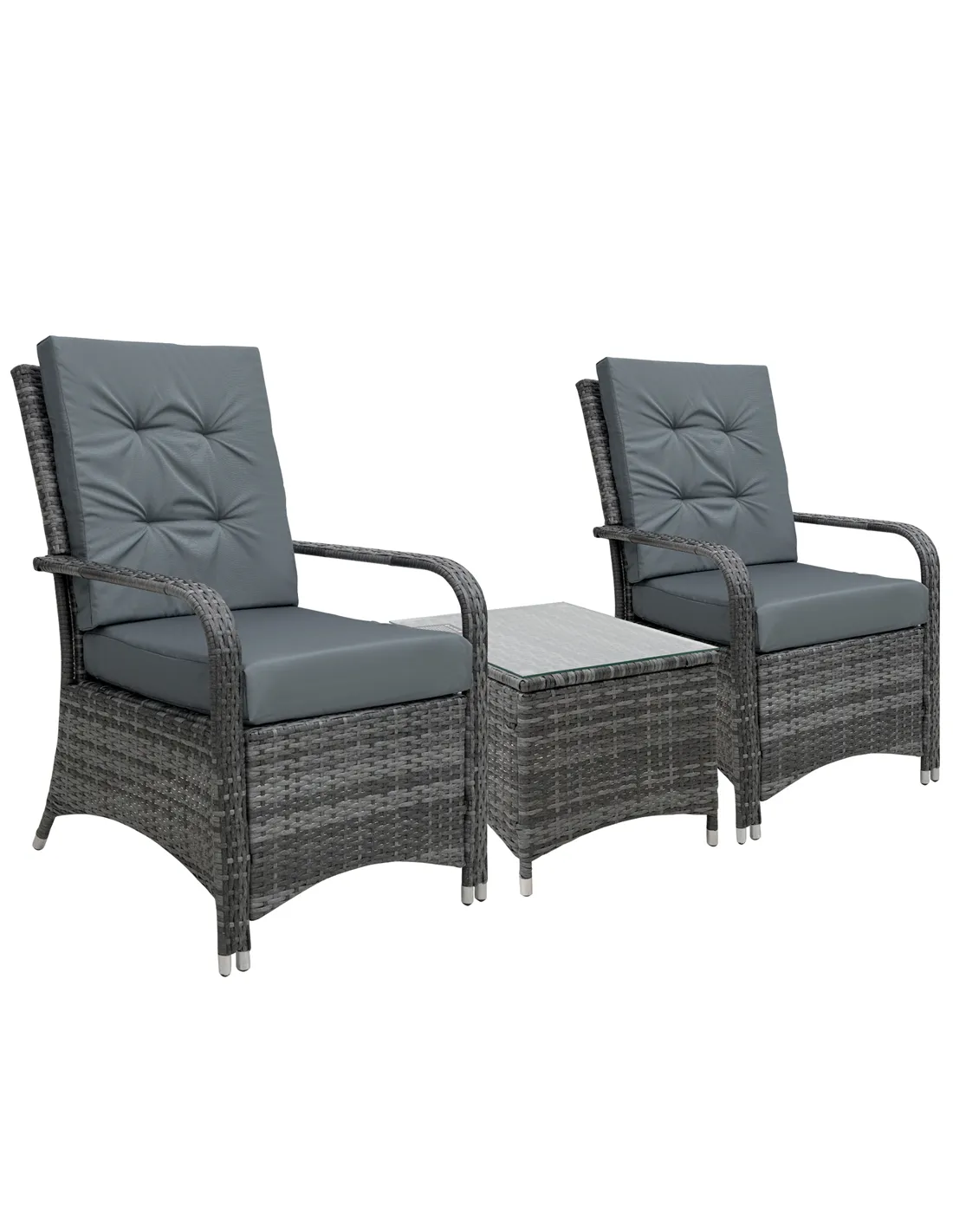 This outdoor bistro set made of PE Rattan is an ideal choice for your garden, patio or balcony. Combined with an steel frame structure and covered with rattan, this set is the optimal set to have. Comes with two seats with cushions and a table with a glass top to place drinks and magazines. The stylish modern design can fit into any style of your home and garden.\n