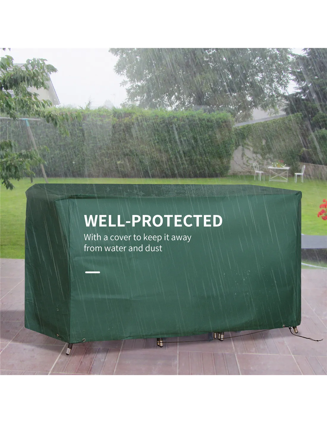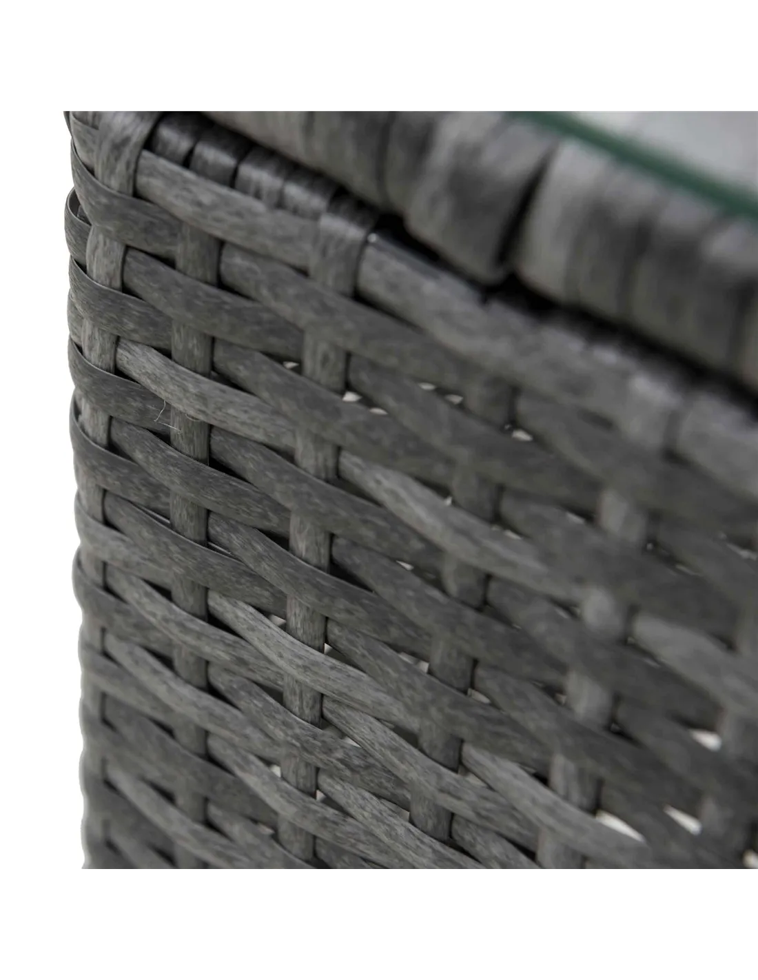The set is crafted from weather-resistant PE rattan and includes a water-resistant cover, making it durable for outdoor use in the UK climate.