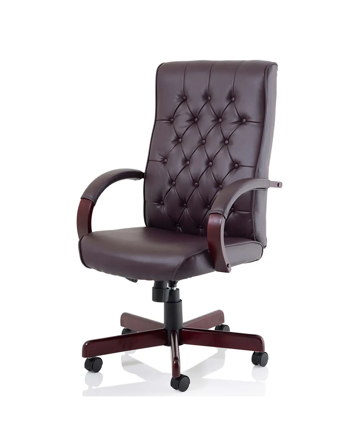 - This elegant office chair, crafted with burgundy bonded leather and a mahogany finish, complements both professional workspaces and stylish home offices. Its traditional button-tufted design and wooden armrests add a classic touch, making it ideal for executive desks or sophisticated study areas.