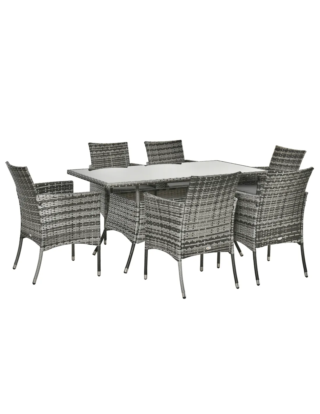 Outsunny 7-Piece Rattan Garden Furniture Set with Cushions, 6 Seater Garden Table and Chairs, Rattan Dining Set with 6 Armchairs, Rectangular Glass Top Table, Grey