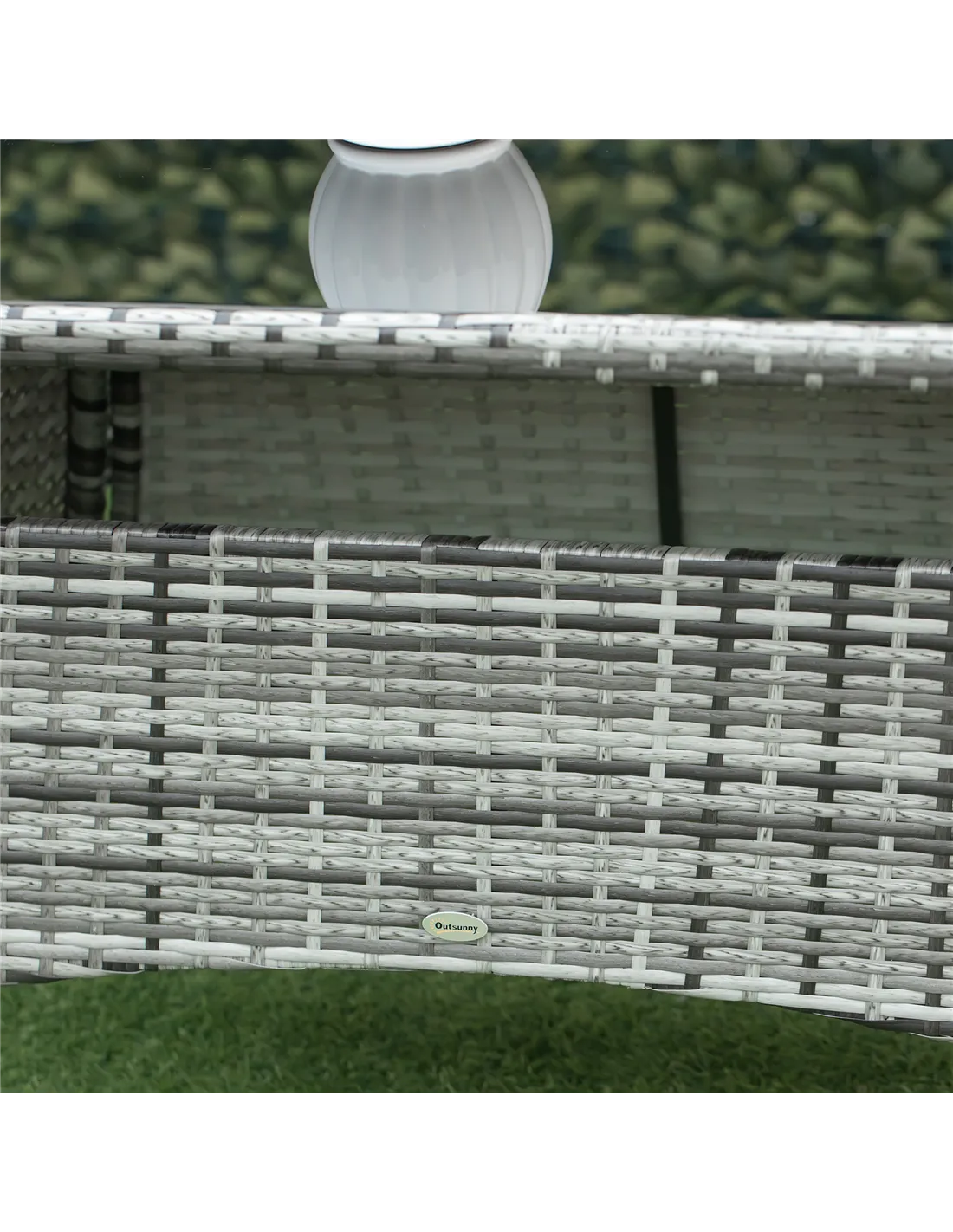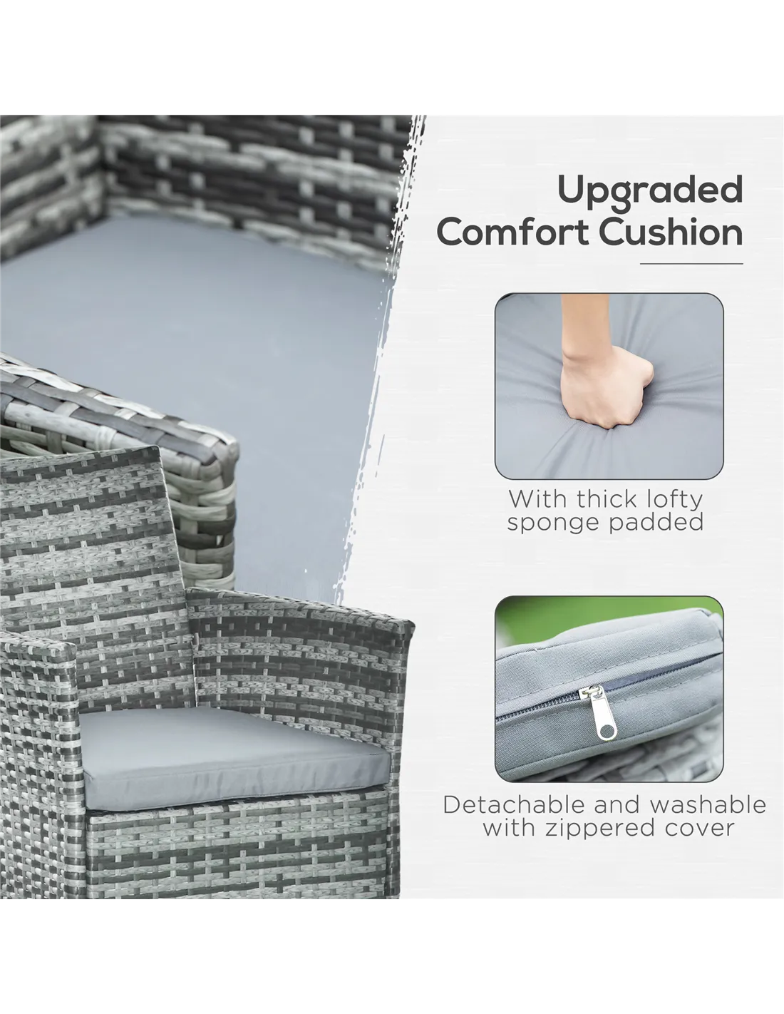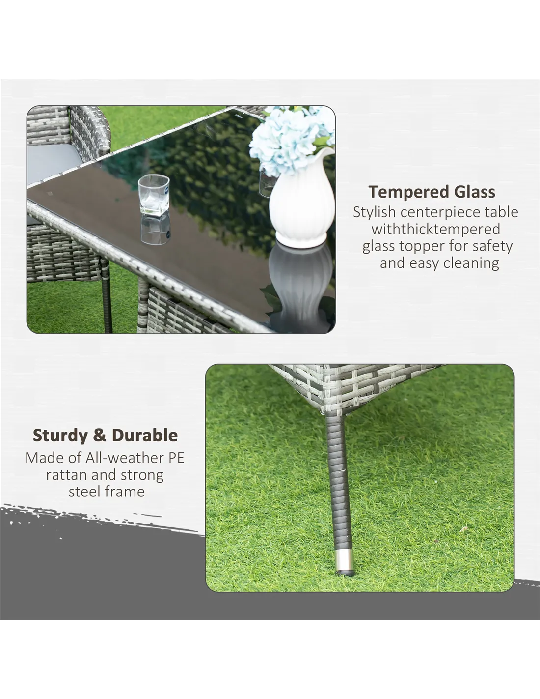 The PE rattan and tempered glass table top can be easily wiped clean with a damp cloth. Cushion covers are removable and machine washable, thanks to their zippered design.