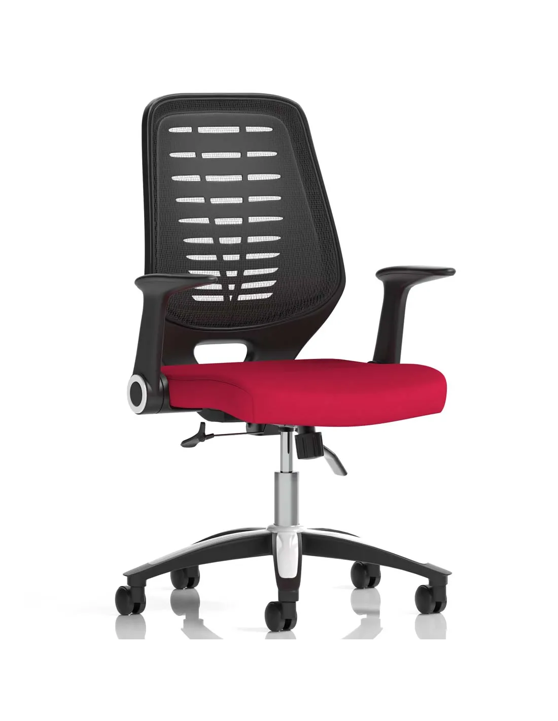 Chosen time and time again, the Relay is the ever popular mesh operator option. Modern styling with silver and chrome accented base & gas lift and easy fold armrests are complimented by a cool vented backrest design that is finished in a choice of either black or silver breathable mesh that allows you to keep your cool. The Relay makes for a versatile chair for all office environments.