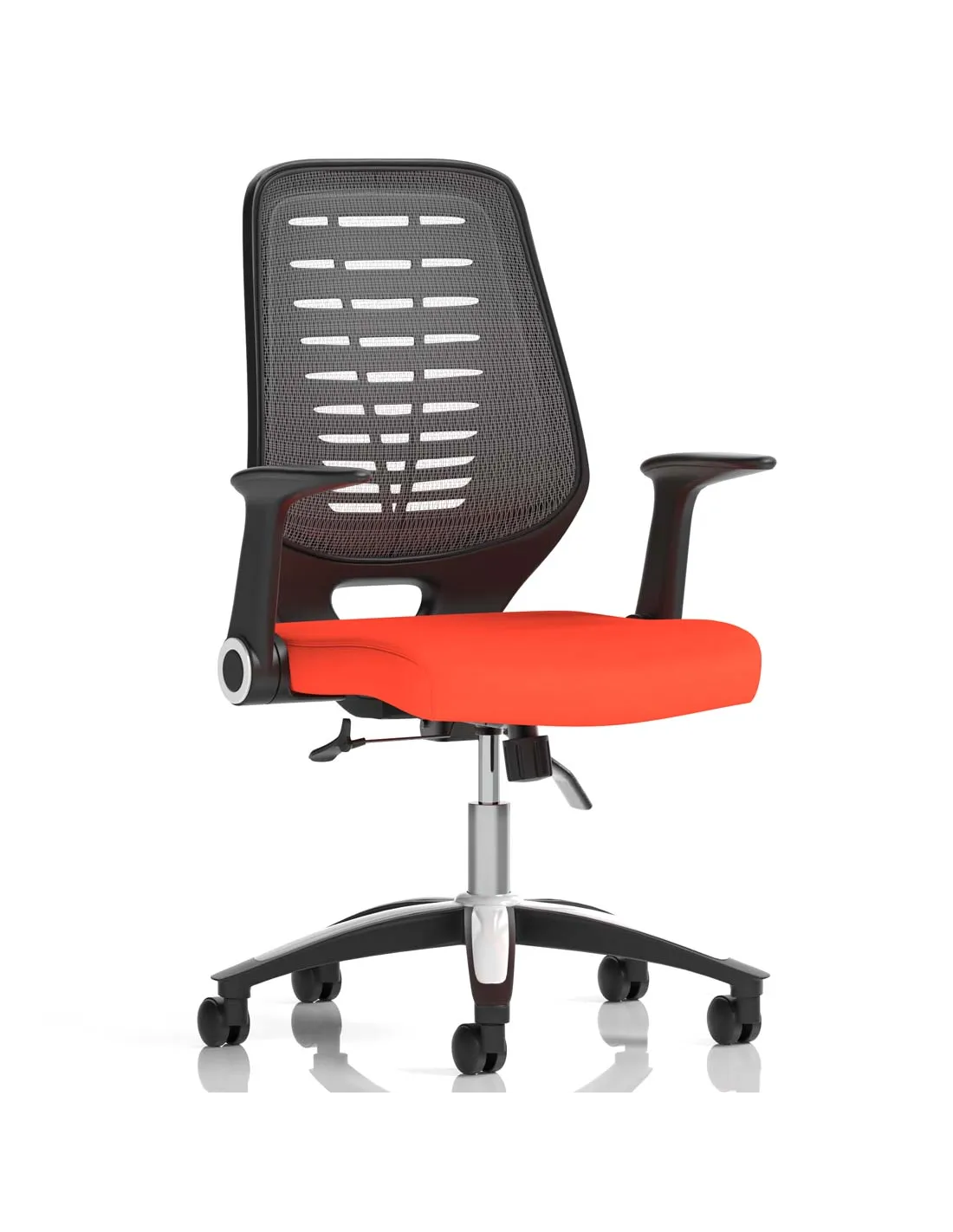At FastDaddy, with over 12 years of experience in online furniture retail, we proudly present the Dynamic Relay Task Operator Chair in bespoke Tabasco Orange with a silver mesh back and folding arms. Crafted by Dynamic Office Solutions - a trusted name in British office furniture since 2006 - this chair offers a perfect balance of style, comfort, and functionality for professionals across the UK.