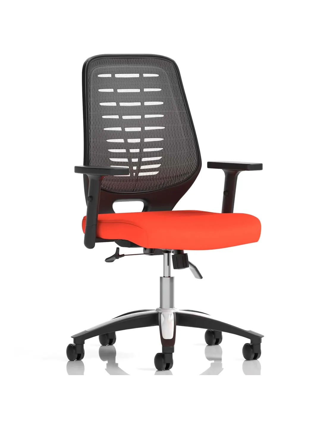 - The chair features a breathable silver mesh backrest combined with a bespoke Tabasco Orange fabric seat, providing comfort and ventilation during long working hours. Its height-adjustable arms and twin lever infinite lock tilt mechanism allow personalised support, making it ideal for various office environments.