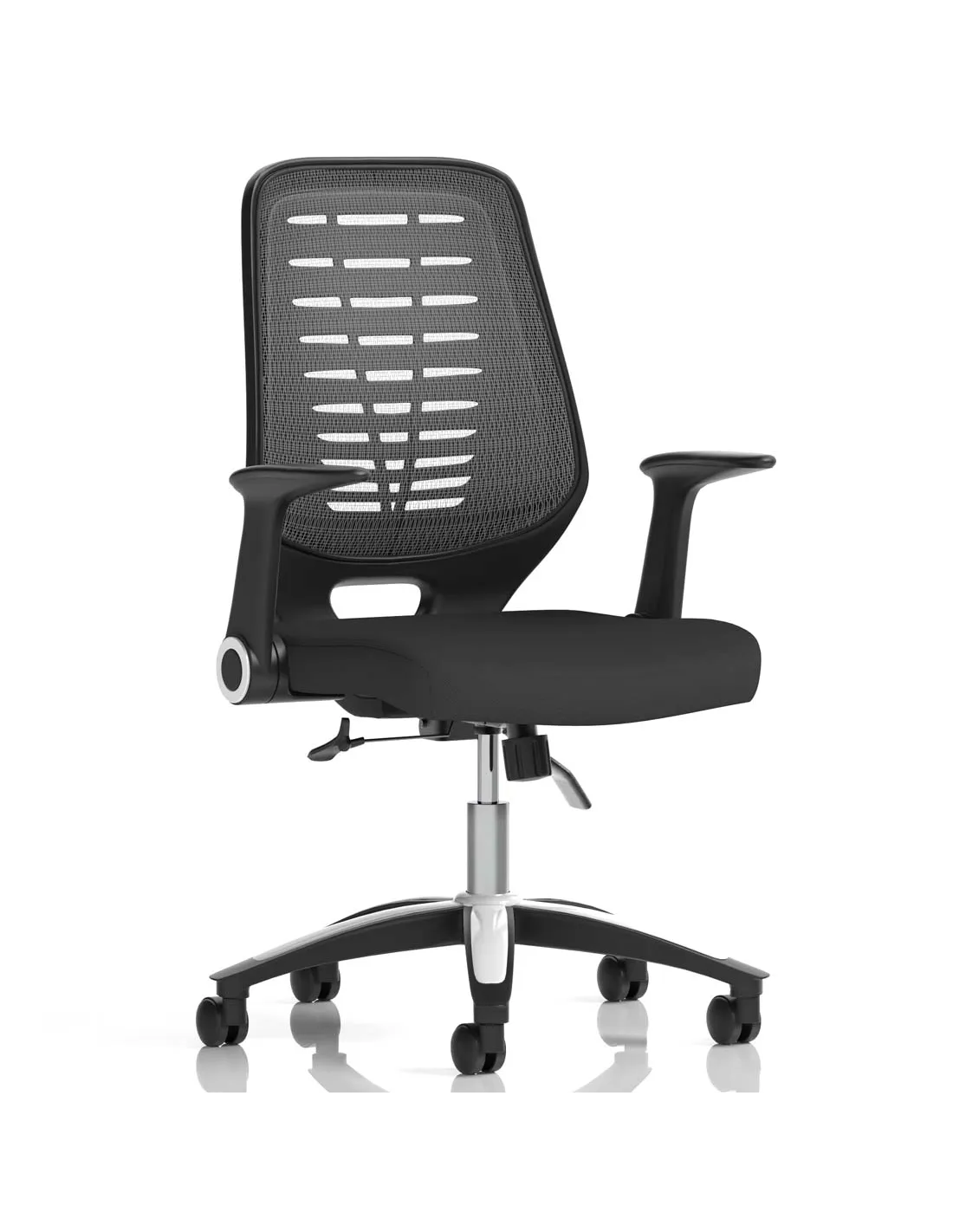Chosen time and time again, the Relay is the ever popular mesh operator option. Modern styling with silver and chrome accented base & gas lift and easy fold armrests are complimented by a cool vented backrest design that is finished in a choice of either black or silver breathable mesh that allows you to keep your cool. The Relay makes for a versatile chair for all office environments.