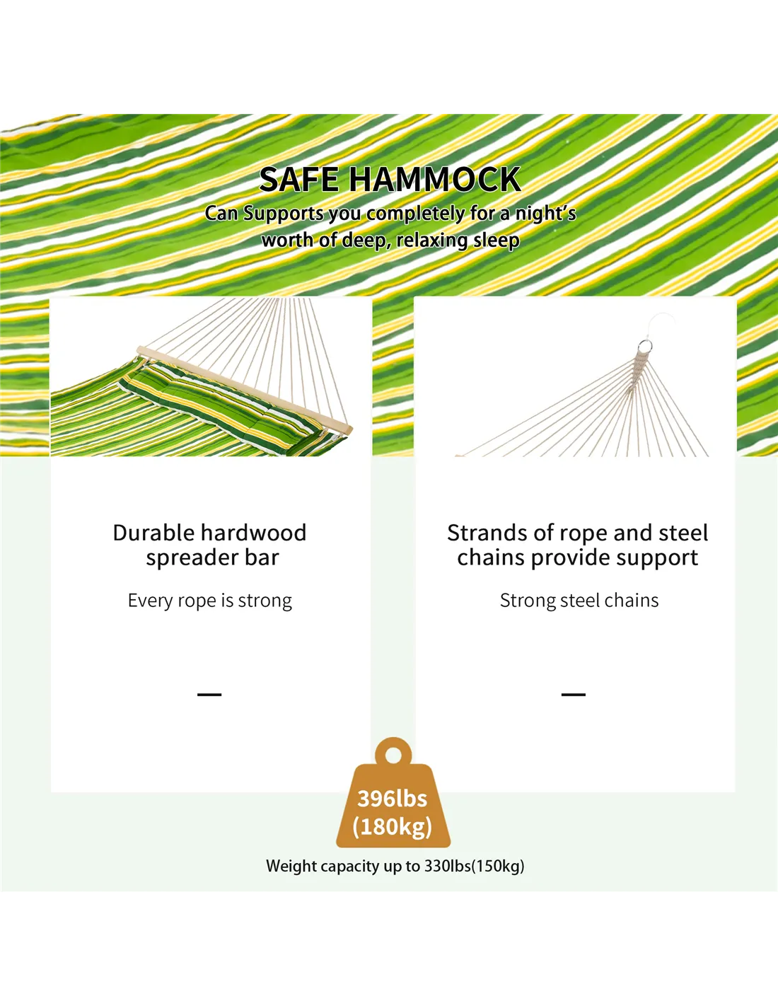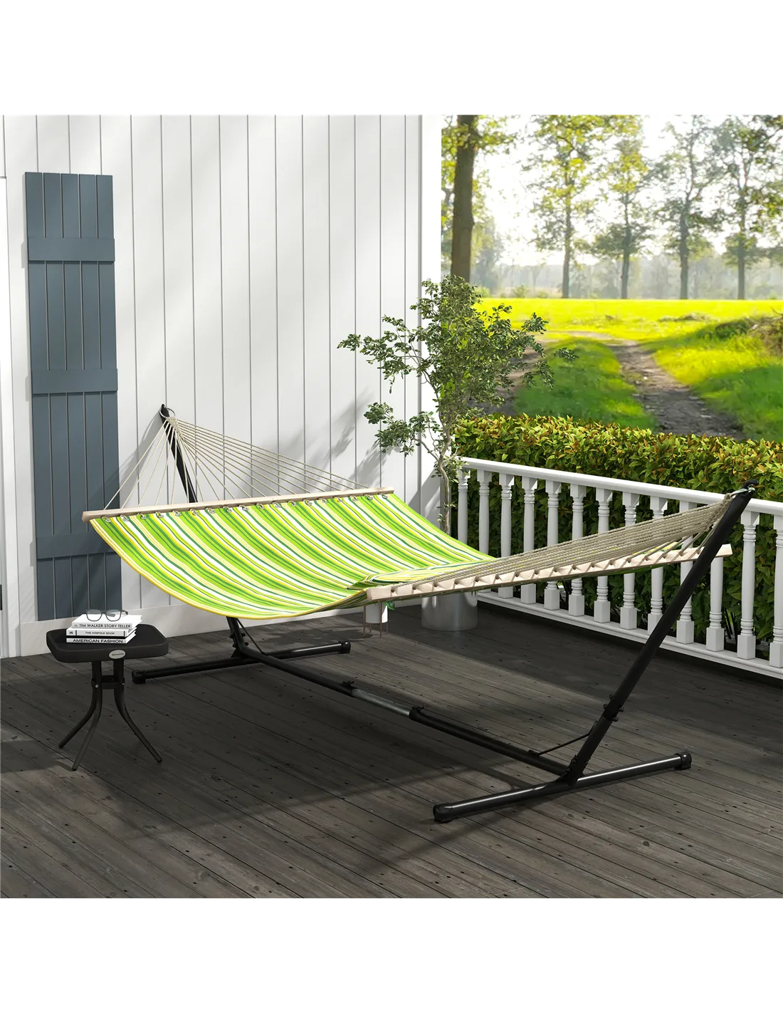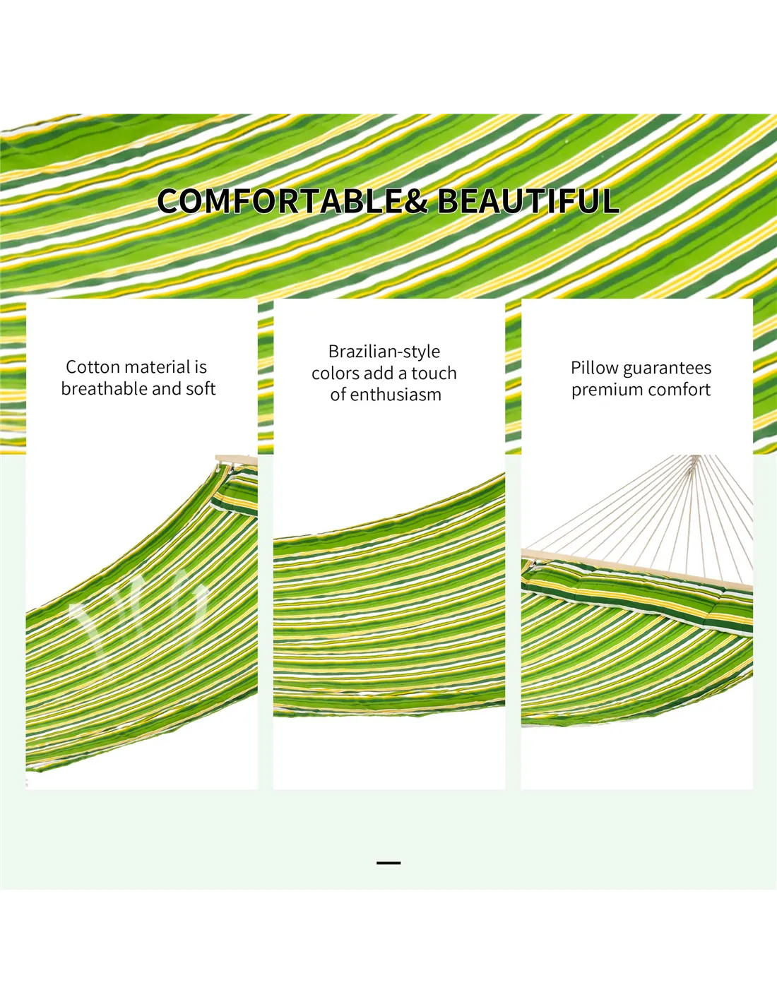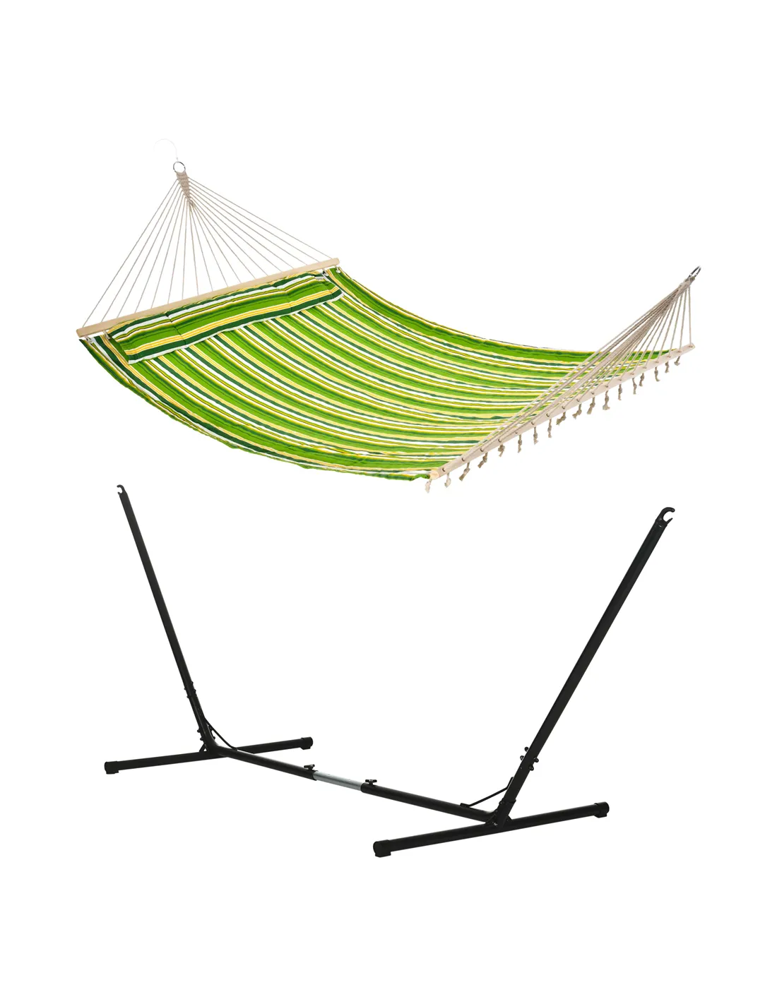 Outsunny Outdoor Garden Hammock with Stand, Double Cotton Hammock with Adjustable Steel Frame, Swing Hanging Bed with Pillow, for Garden, Patio, Beach, Green Stripes