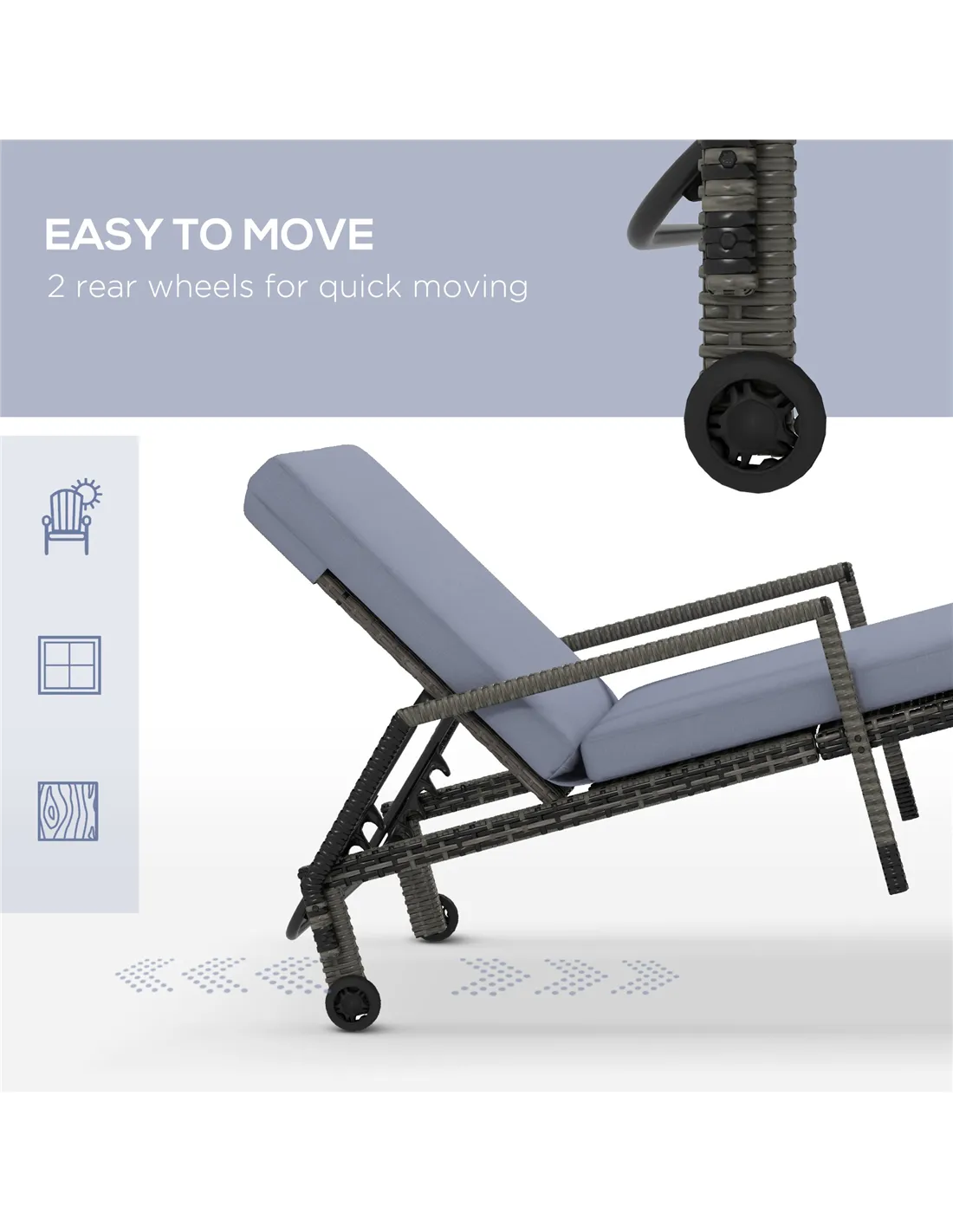 This Outsunny sun lounger set is great for all-day relaxing. With a longline padded cushion and five-position back, this is a comfortable piece that can be customised to your choice. A metal frame for a strong core, wrapped in plastic wicker - protecting the metal whilst creating a stylish garden look. Complete with wheels to move around easily.